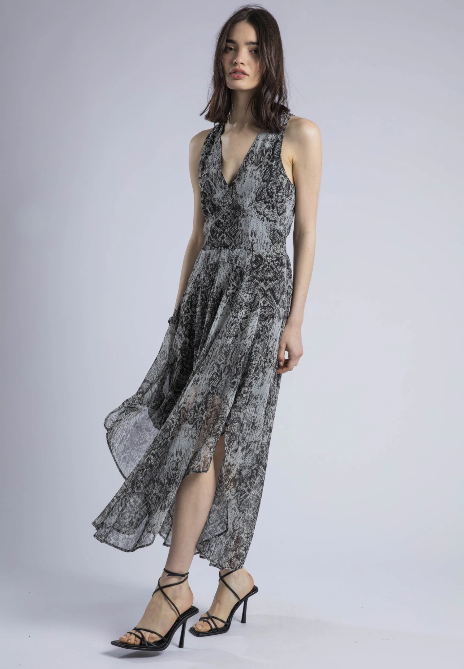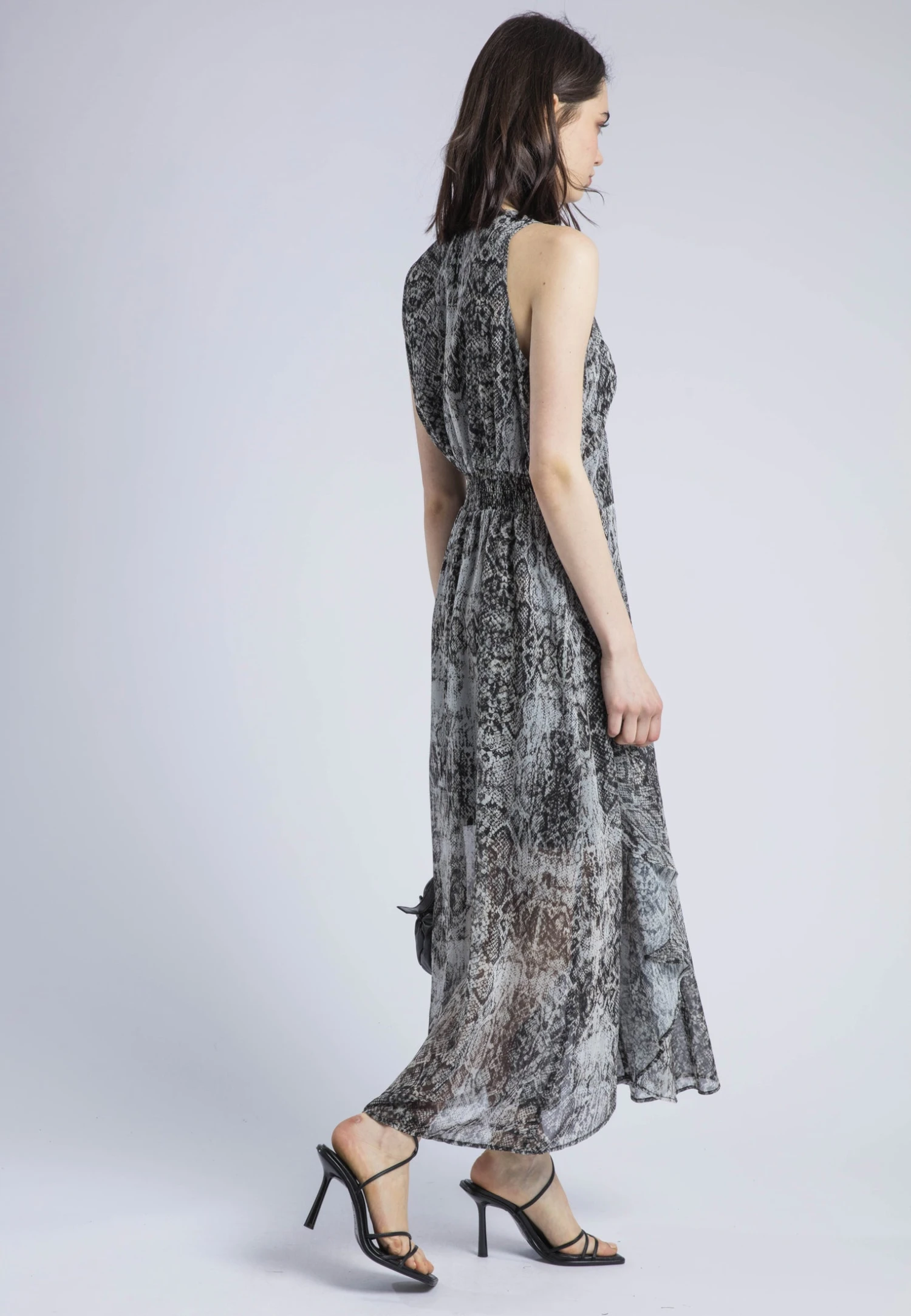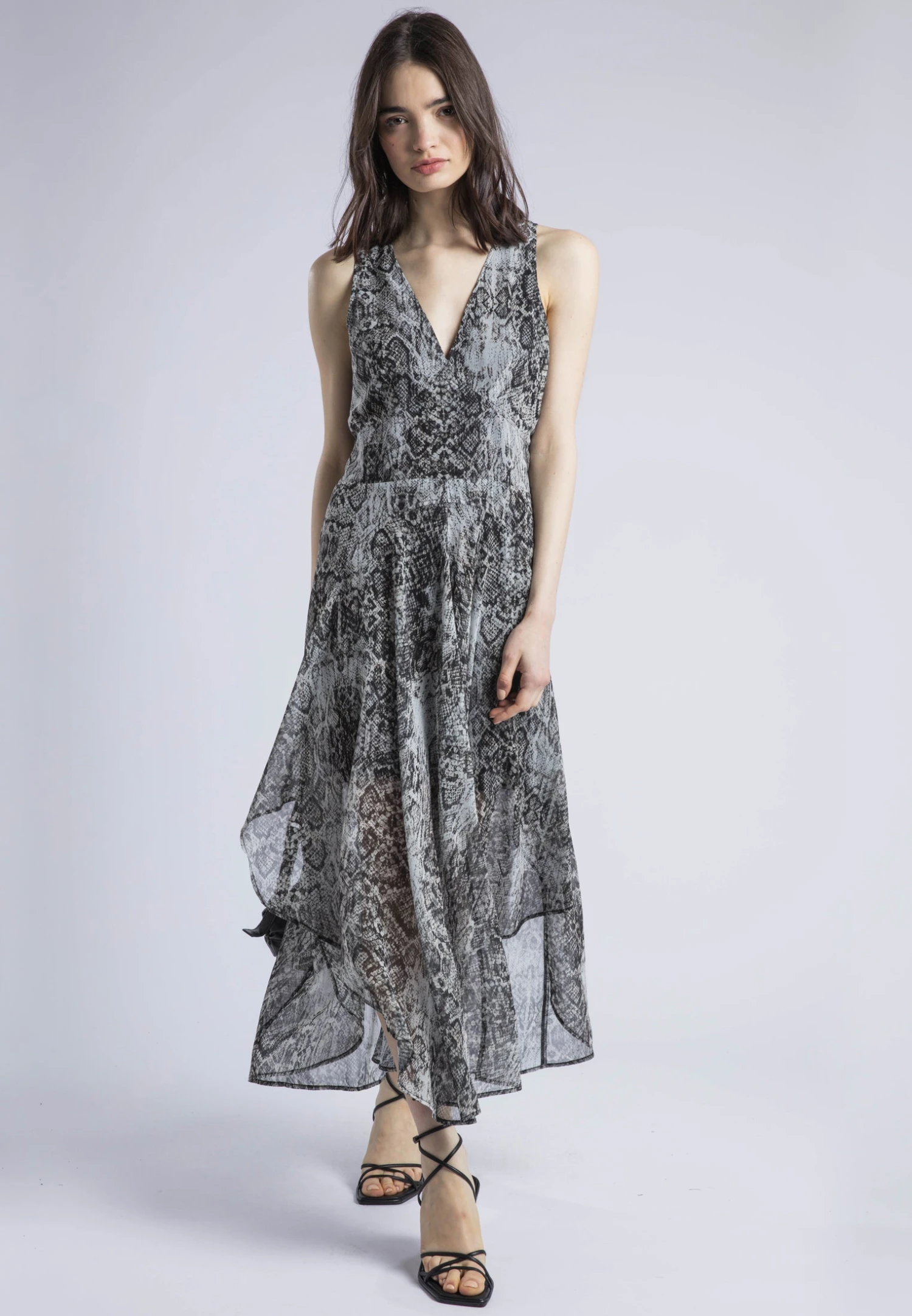 The Aida Midi Dress is a versatile and chic choice for any occasion made in our Slither snake print in grey tones. With its midi length, it offers an easy fit and comfortable style. The V neck and fitted waist with elasticated back detail provide a flattering silhouette, while the cut-out detailing at the hem add a touch of sophistication. The full skirt and sleeveless design makes it suitable for both day and evening events, and you can complete the look by wearing it with ankle boots or heels. The Infinity Midi Dress is a must-have addition to your wardrobe for effortless style and elegance. The model wears a size UK 10. 55% of the fabric is made from recycled plastic bottles. Length: 132 cm