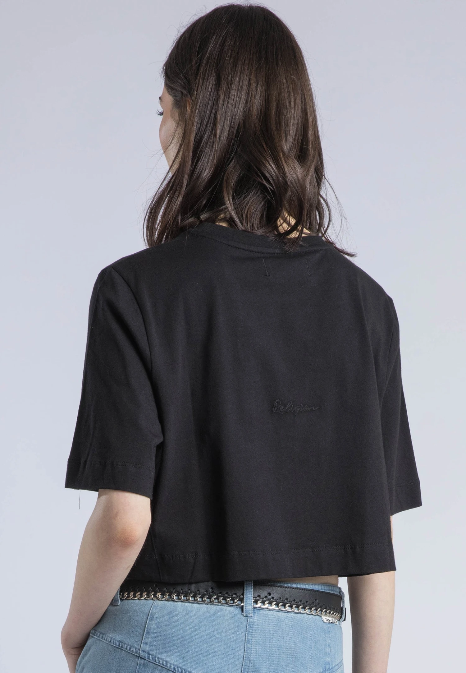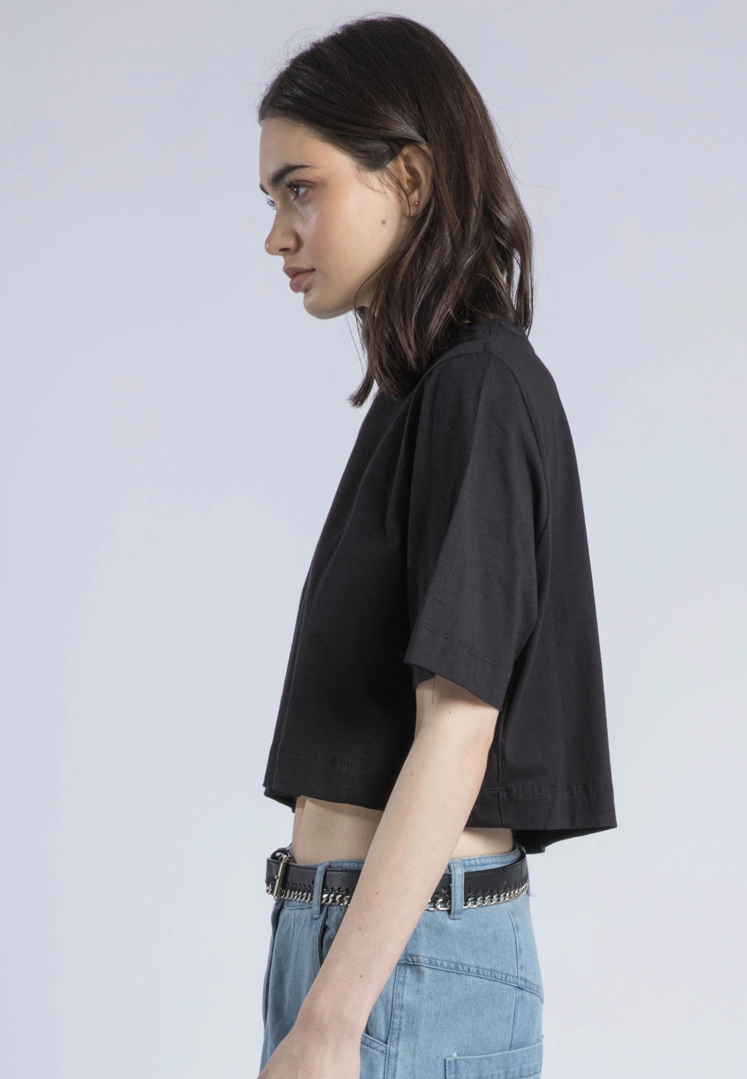 The Crop T-Shirt in black is a stylish and versatile tee crafted from soft, sustainable cotton jersey. Featuring a classic crew neck, short sleeves, and a flattering cropped length, it’s perfect for layering or wearing on its own. Finished with RELIGION signature embroidery at the back neck, adding a distinctive and timeless touch to your wardrobe. The model wears a UK size 10. Length from the top: 45 cm.
