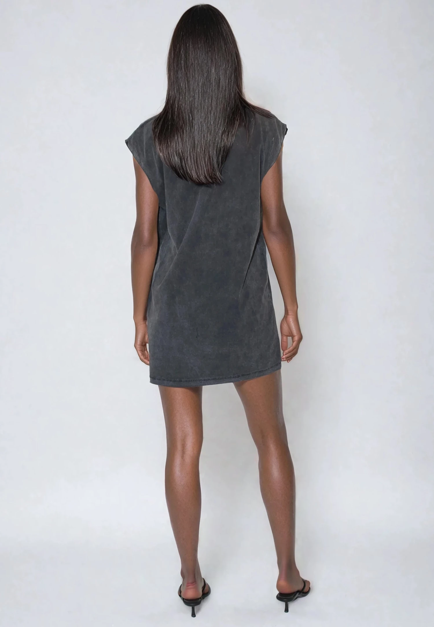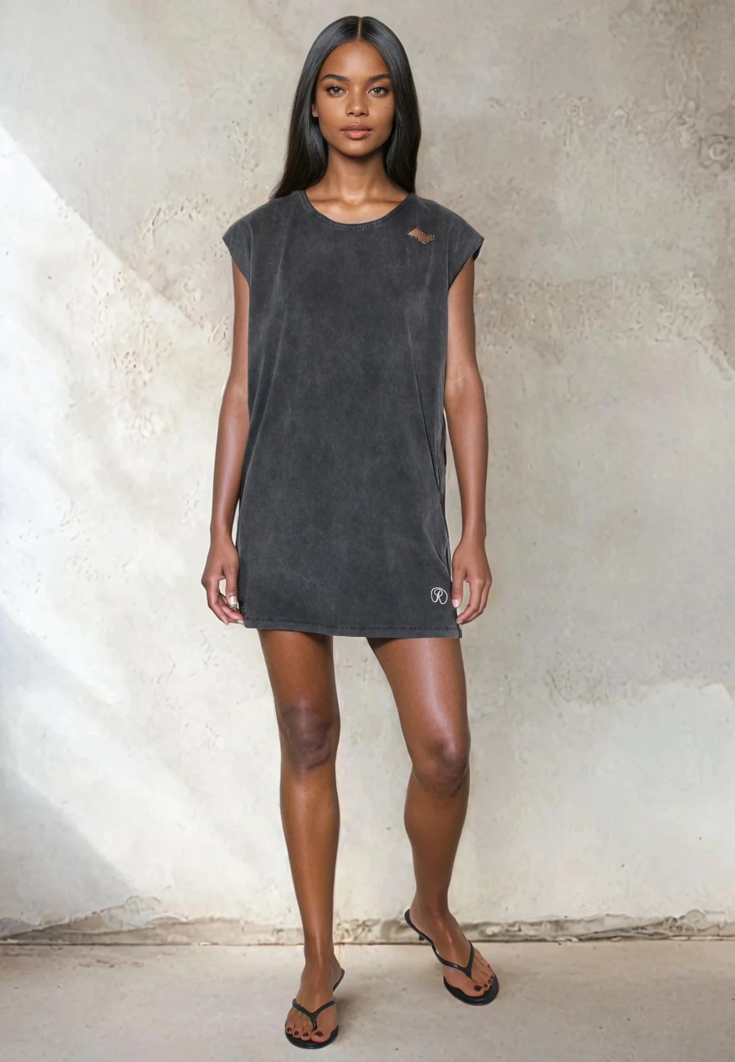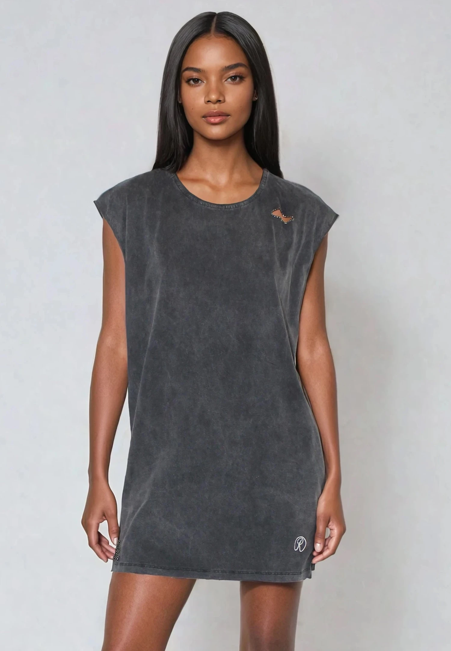 The Beaded mini Dress is a casual statement piece with an edge. Made from soft black jersey, it features rip detailing at the hem and neckline with beading around the holes for a deconstructed feel. Designed with a raw-edge round neck, cap sleeves, and a relaxed fit, this short-length dress is effortlessly cool and easy to wear. The model wears a size UK 10. Length from the top: 88 cm