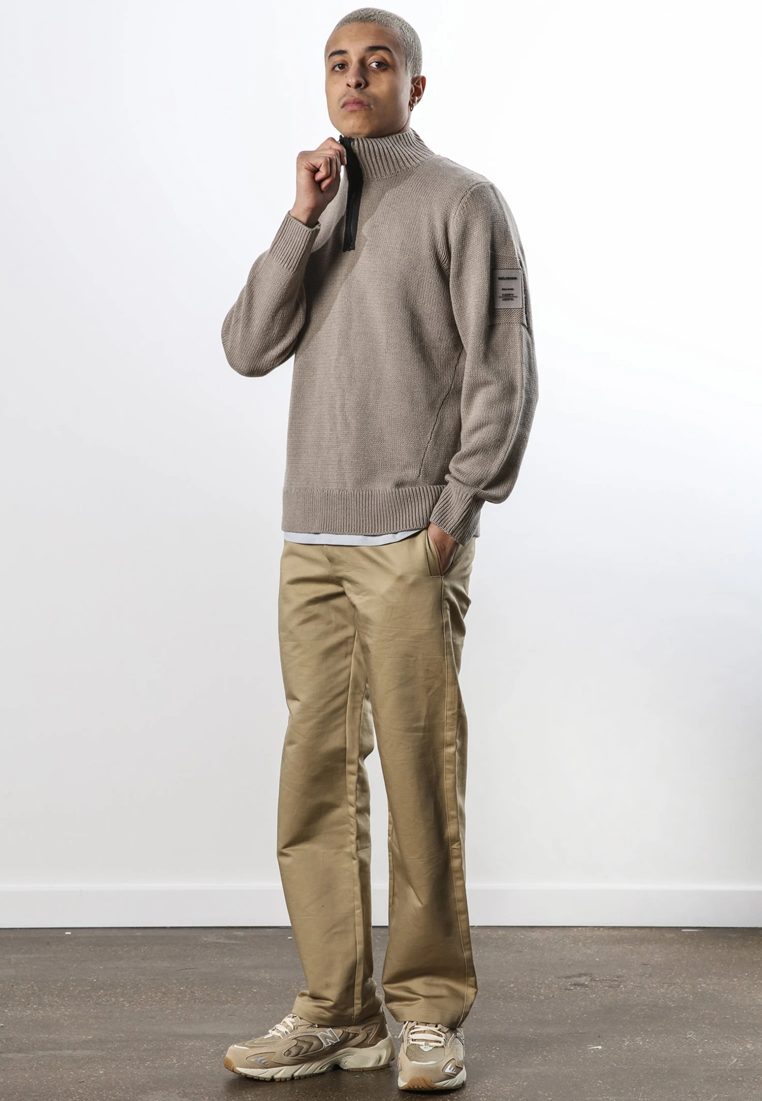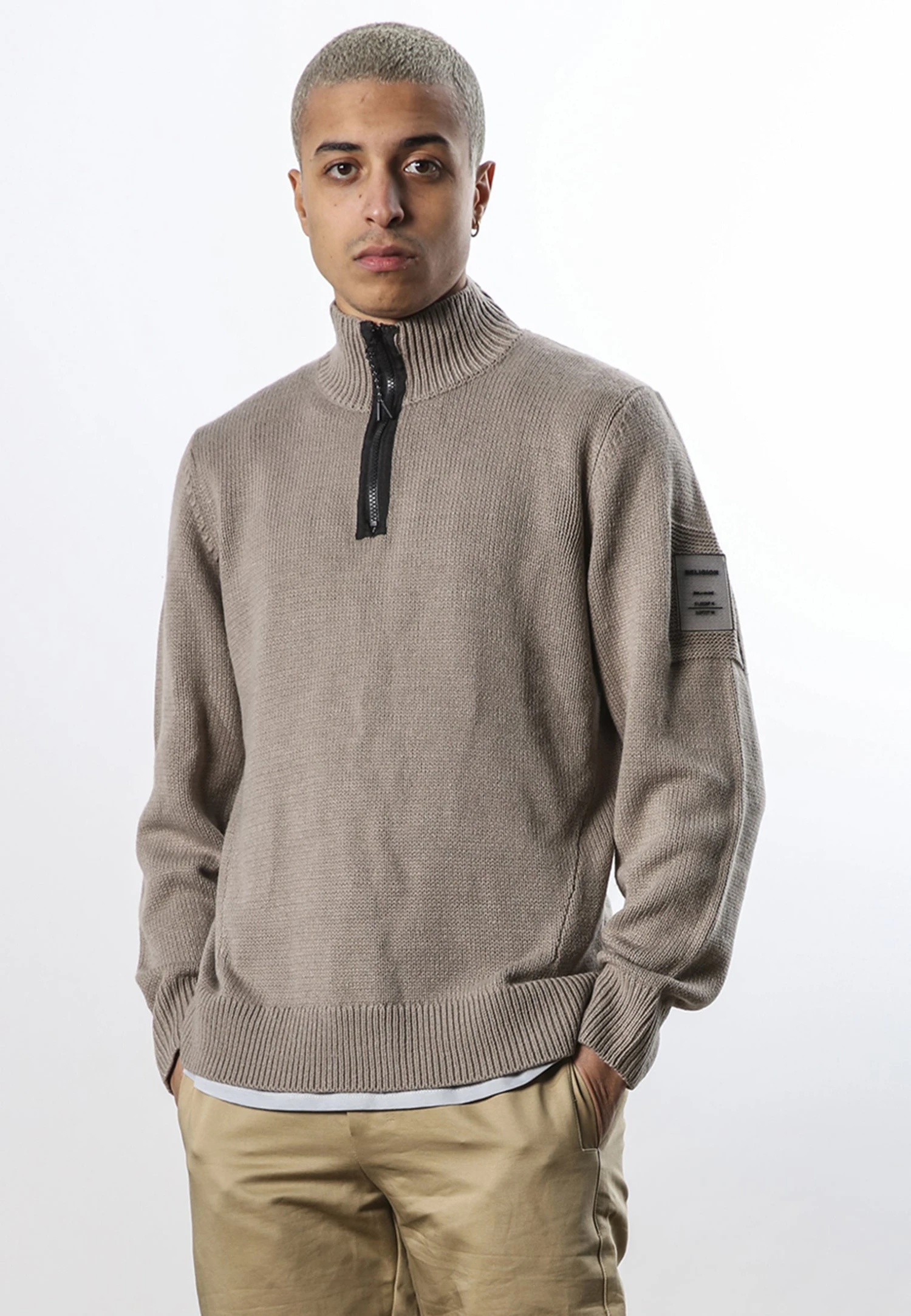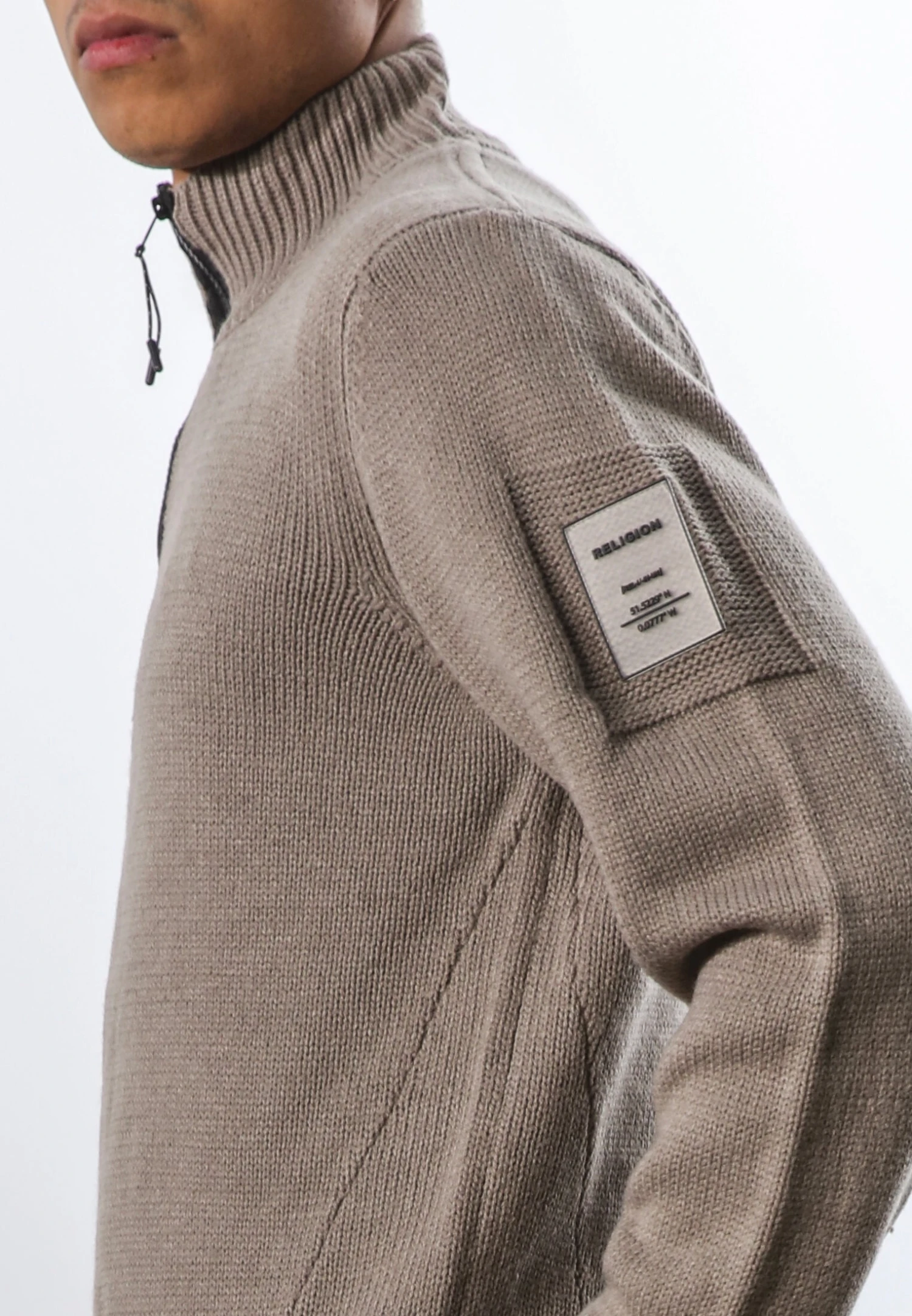 The Box Half Zip Knit comes in twig. Relaxed fit. Funnel neck Exposed zipper. Featuring clear RELIGION patch on the arm and ribbed trims.