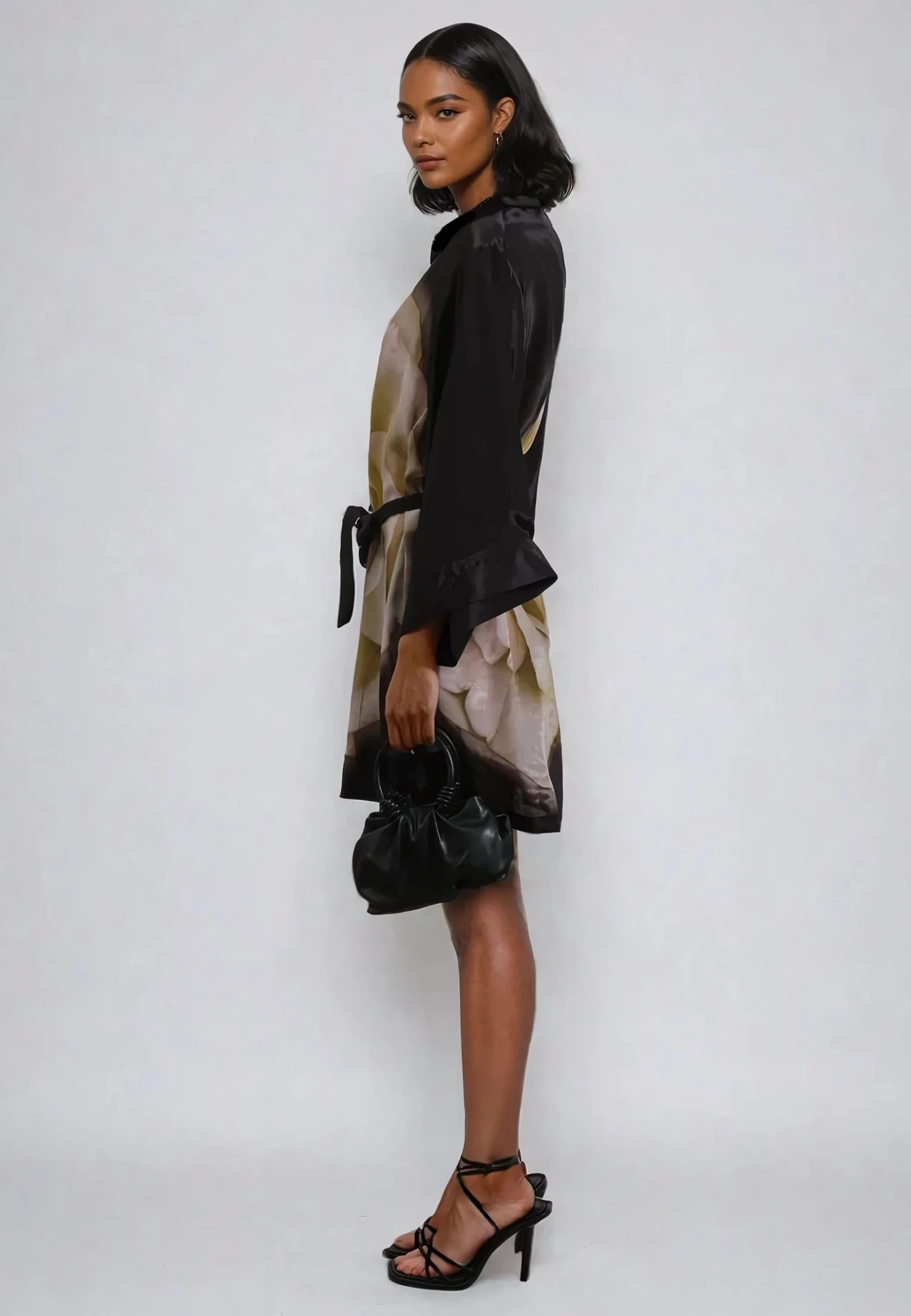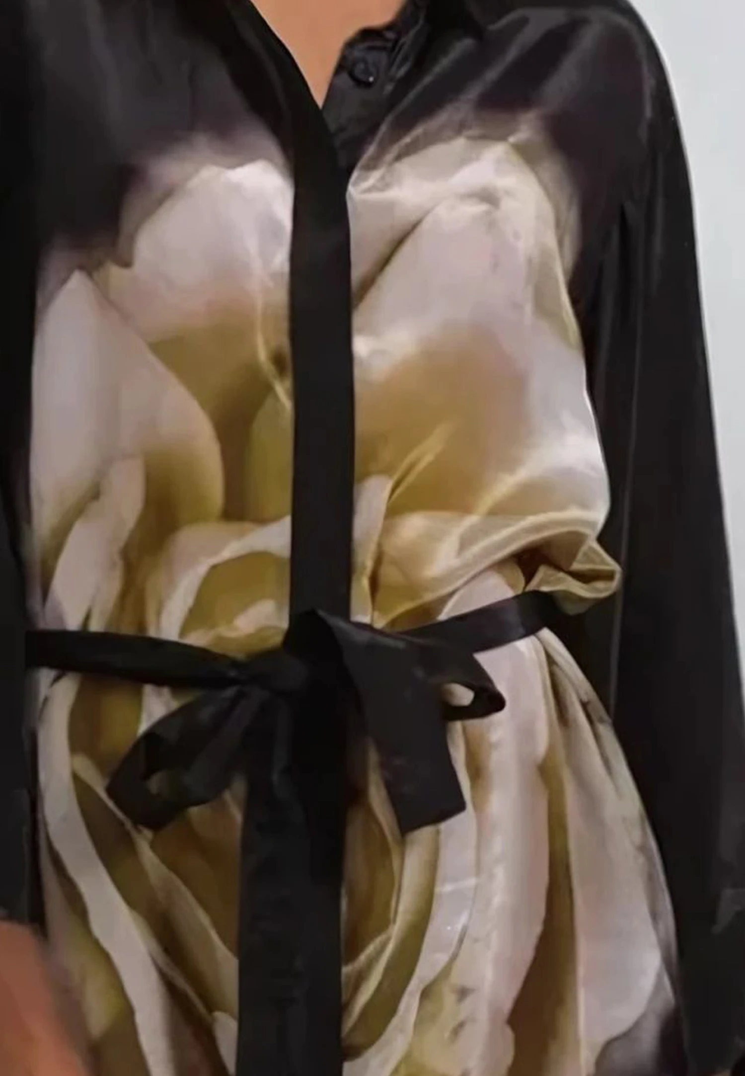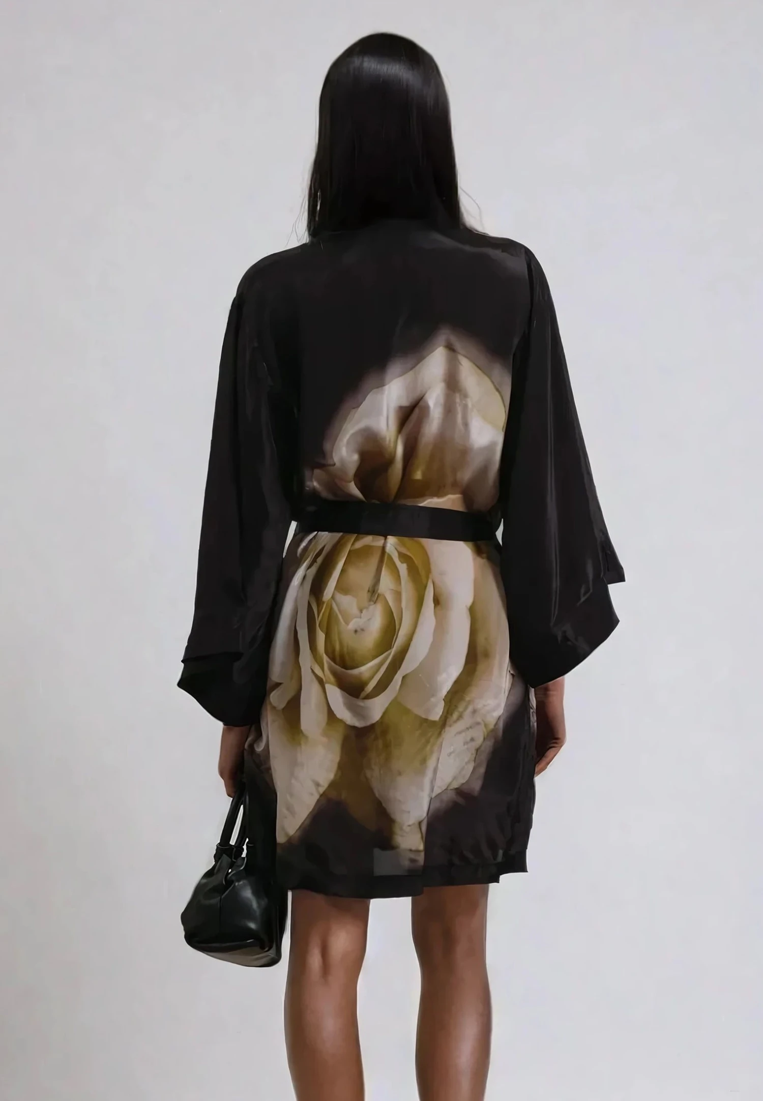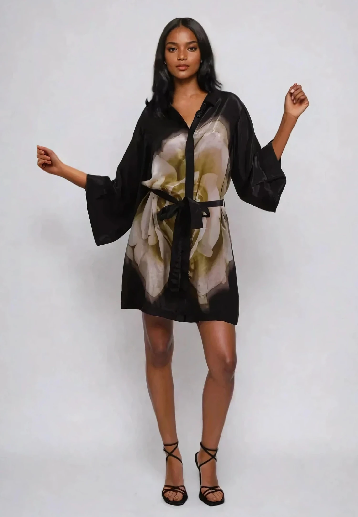 The Coco tunic is a statement piece with assured appeal in our large floral Glow print in neutral tones on a black base. Our best-selling shape, this style is made from a vegan silk and features a grandad collar, button through placket, short sleeves and pockets. Wear as a dress with or without belt, or open layered over a top and jeans as a layering piece. This is an oversized style, please go down 1 size if you like it better less oversized. The model wears an size UK10. Give the style a gentle steaming before trying it on as the shipping might crease the fabric. The length from top shoulder is 90 cm. Chest width is 138 cm on the circumference.