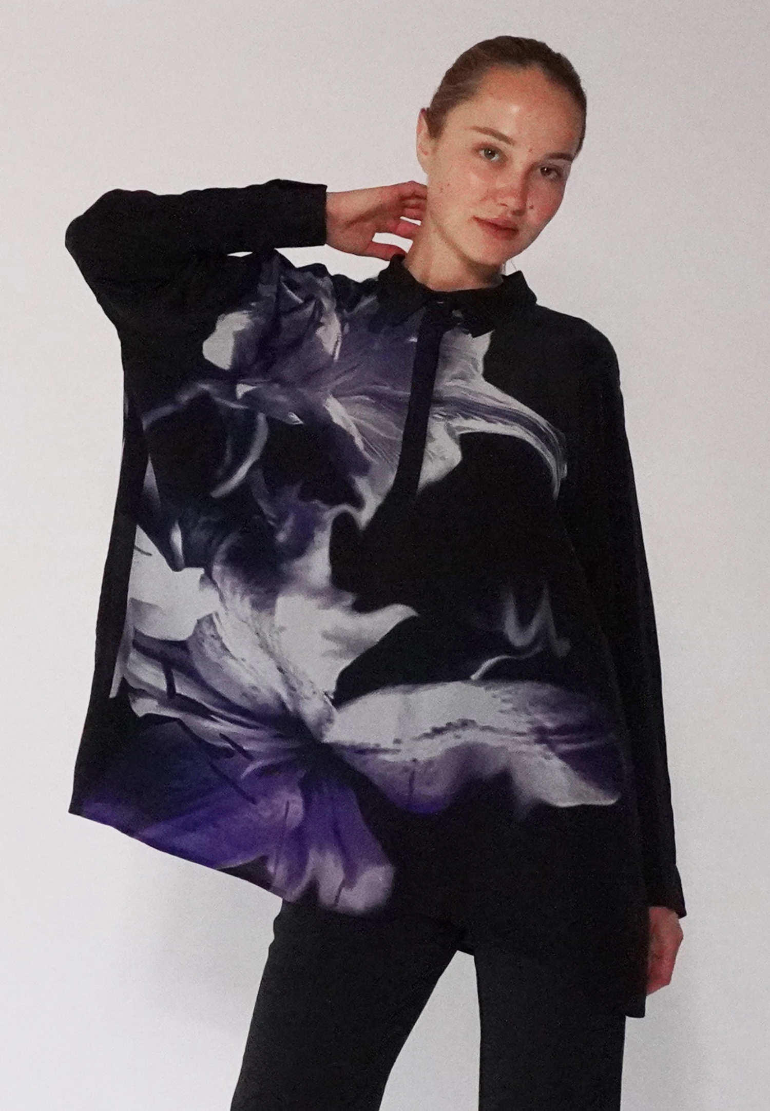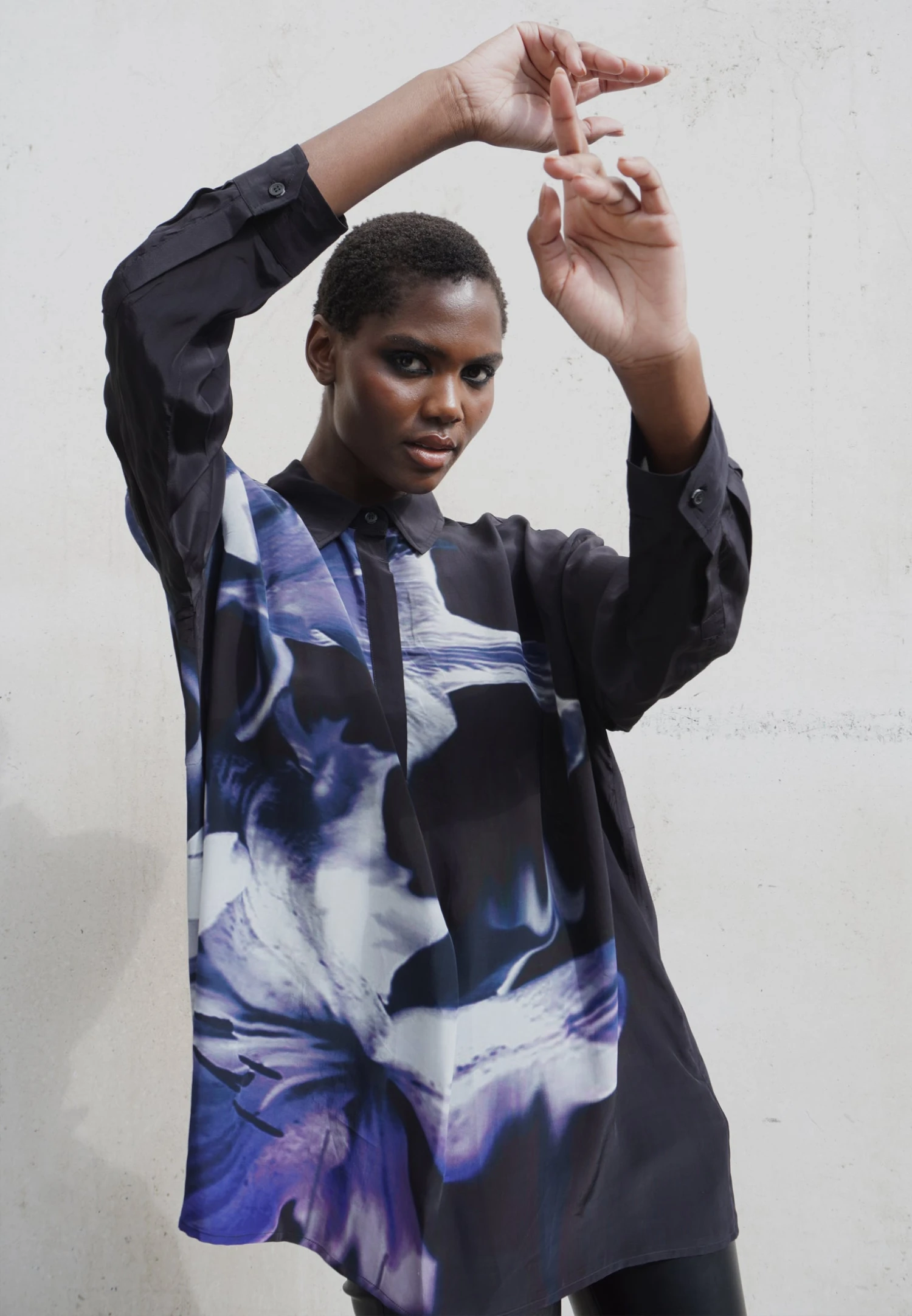 The Constellation shirt in our floral Lily print in blue colours, is cut from a smooth fabric for a sensual feel and a luxurious look. Designed in a relaxed shape with a classic collar, long sleeves and an oversized fit. Update any look with this shirt for an easy desk-to-dinner edit. The model wears a size S, please go down 1 size if you like it better less oversized. Please give the garment a gentle steam before trying on as the fabric might get creased during shipping. The shirt is dry clean only.