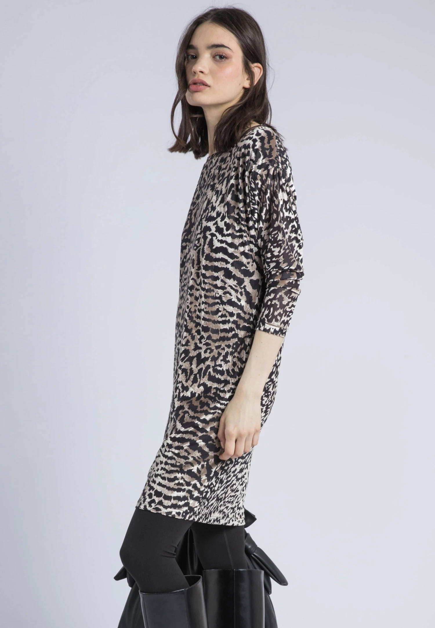 The Emmy Dress is a stunning party piece crafted from burn-out velvet in a silver and black animal jacquard pattern. Featuring a boat neck, long sleeves, and an oversized fit, it is cinched at the waist with a tie belt for added shape. The short length completes this elegant and bold dress, perfect for any special occasion. The model wears a size UK 10. Length from the top: 90 cm
