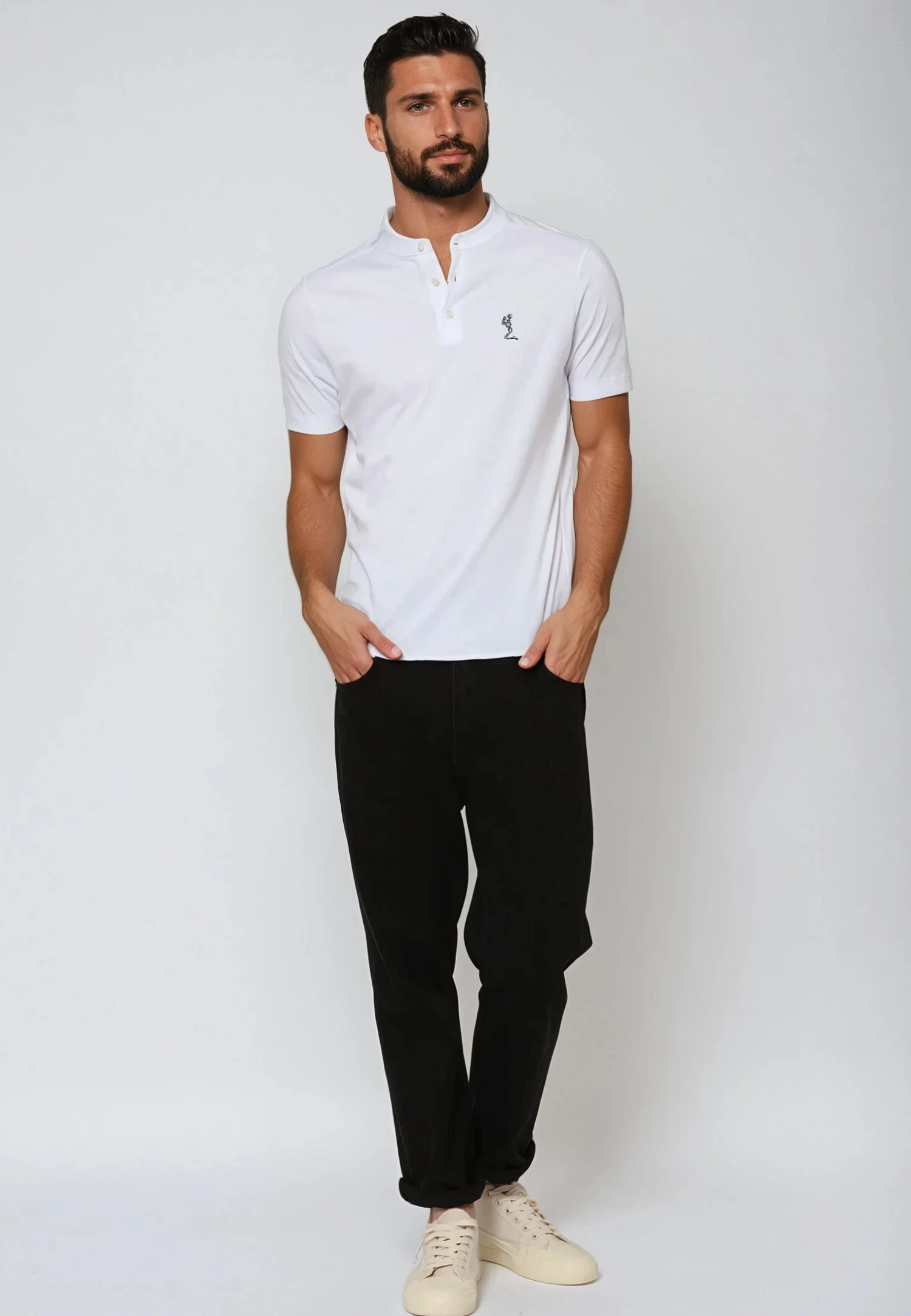 Our short-sleeved Orson Polo in plain white is made from soft cotton. Featuring a granddad collar neckline with our praying skeleton graphic printed on the chest. Designed to a muscle fit. Explore our signature plain collection and effortlessly update your wardrobe.