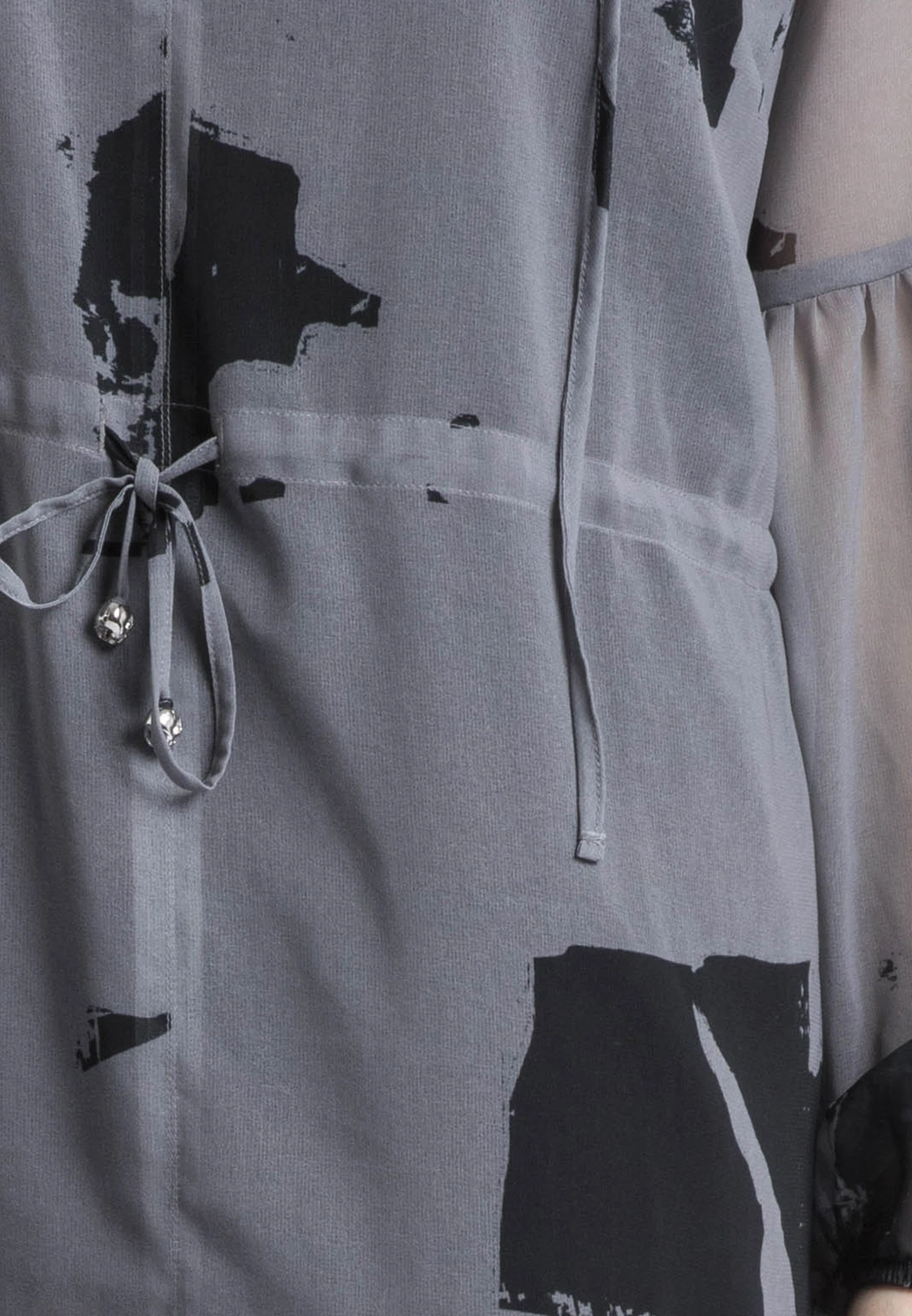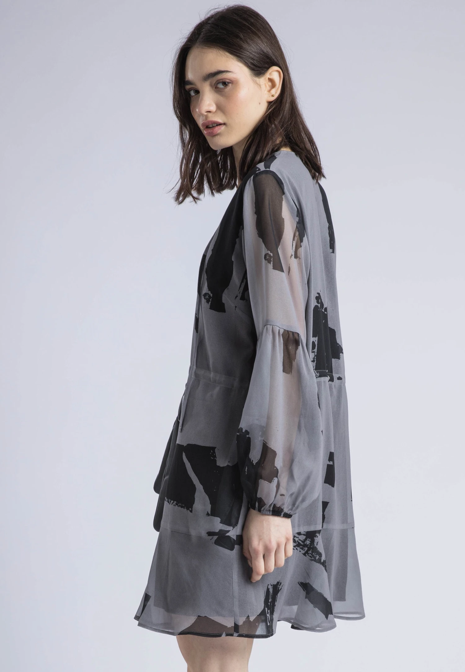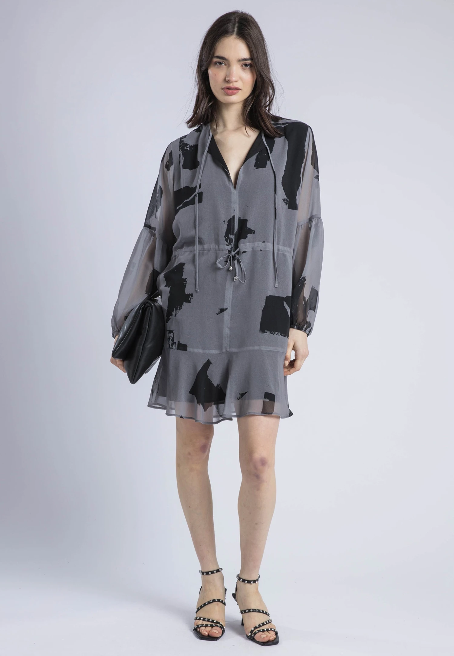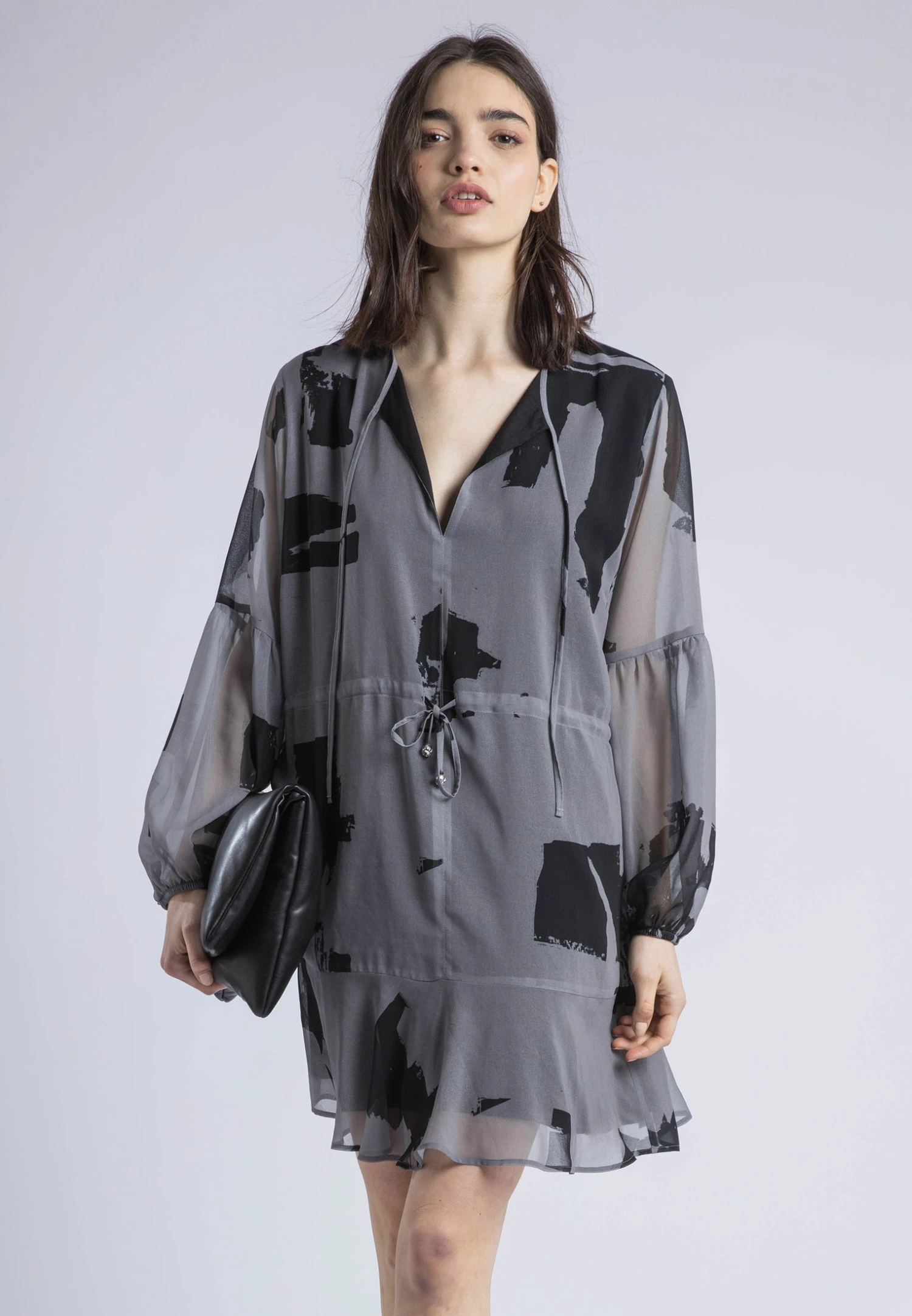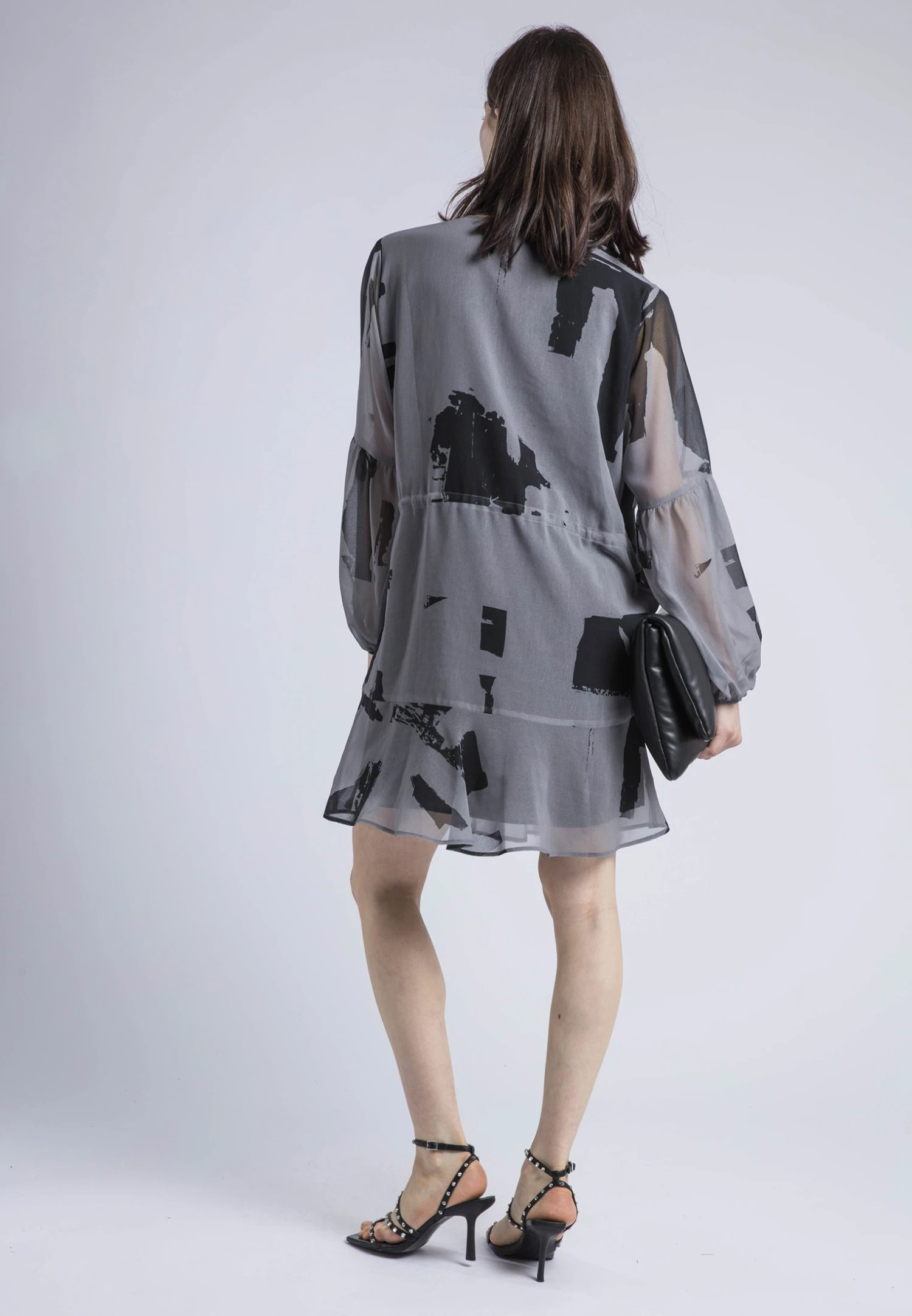 The Eternity dress is a chic choice with a short length for easy wear made in our abstract Facade print in grey and black tones. It features a round neckline with a slit and ties, long sleeves with gathered cuffs, and a relaxed fit. You can pair it with ankle boots or heels for a stylish look, and the tie waist with tie and skull cord ends adds an extra touch of flair to your ensemble. The model wears a size UK10. 55% of the fabric is made from recycled plastic bottles. Length: 88 cm