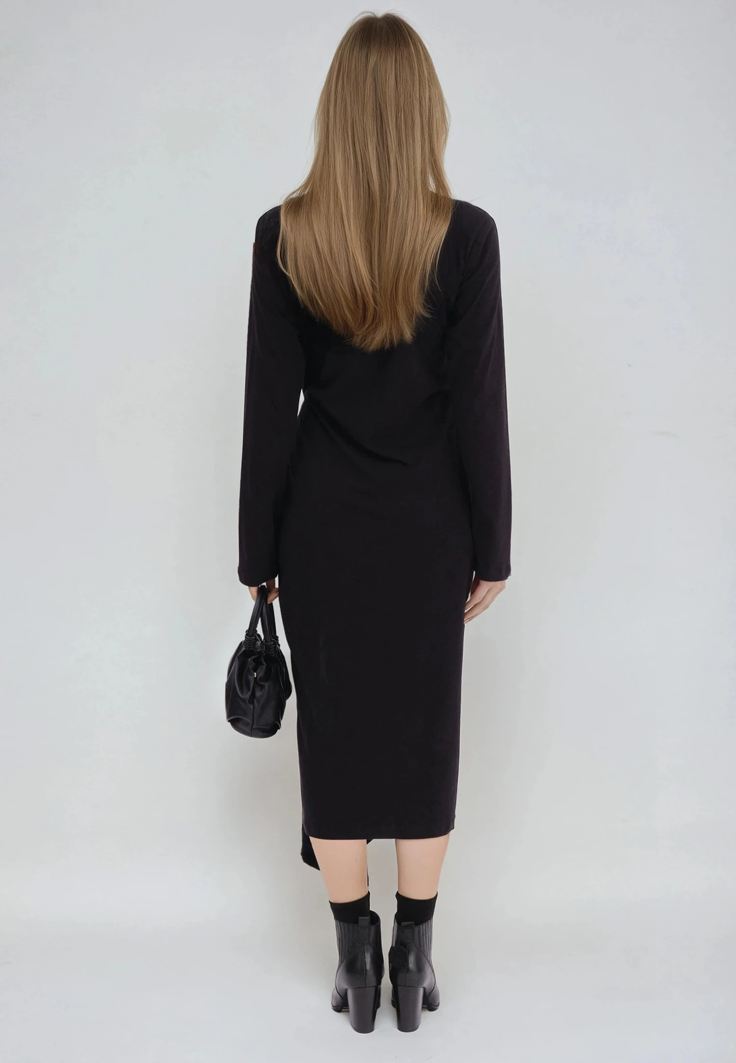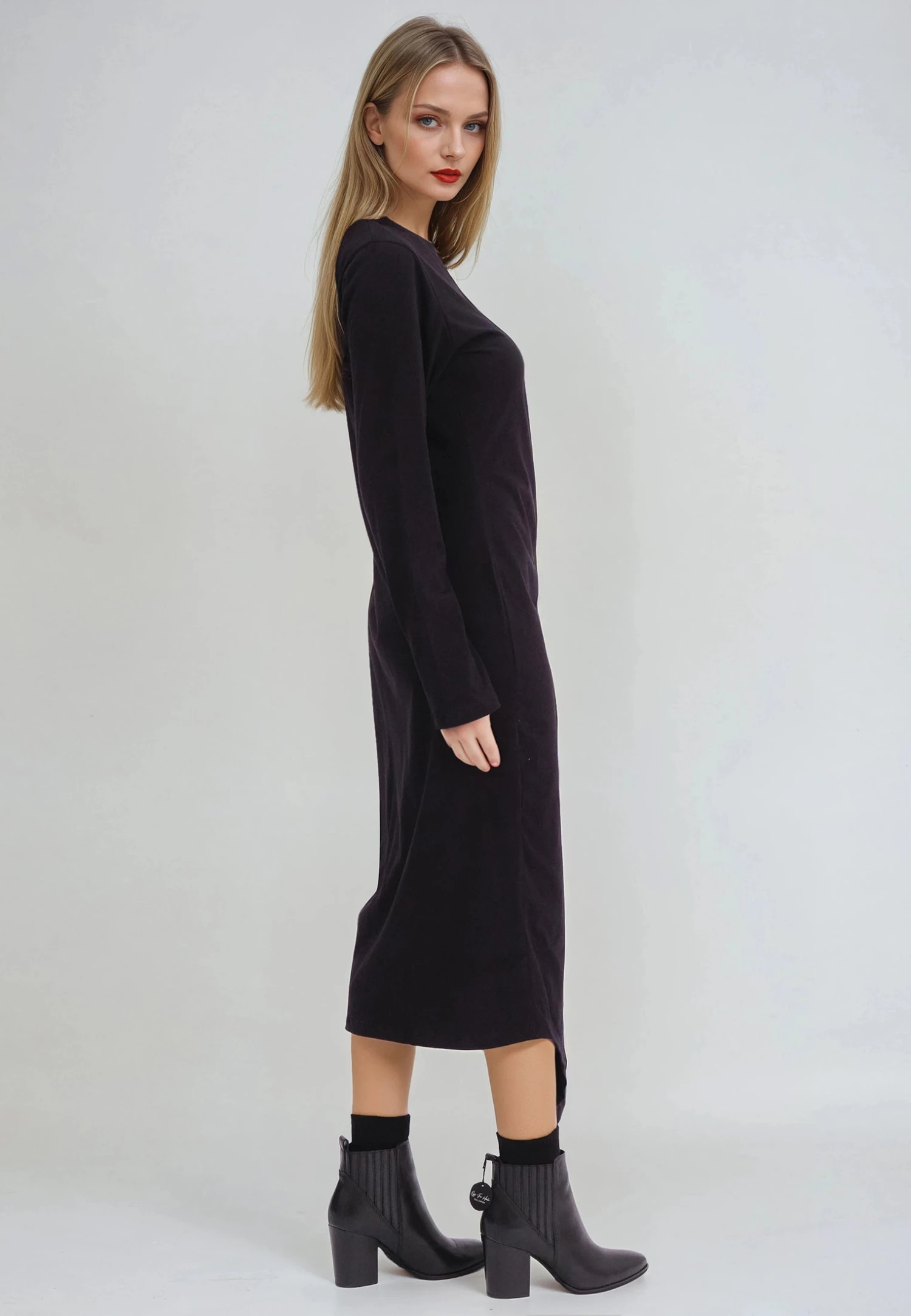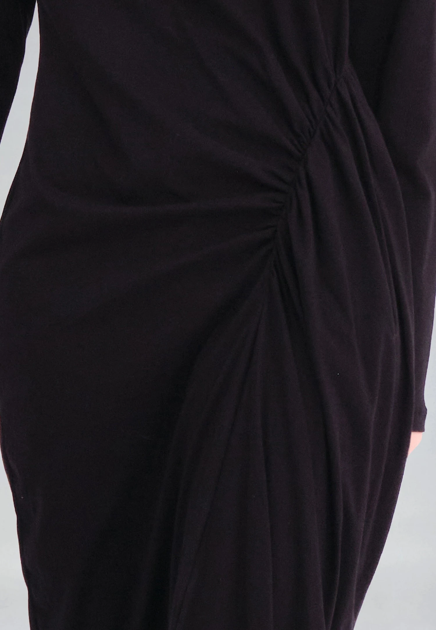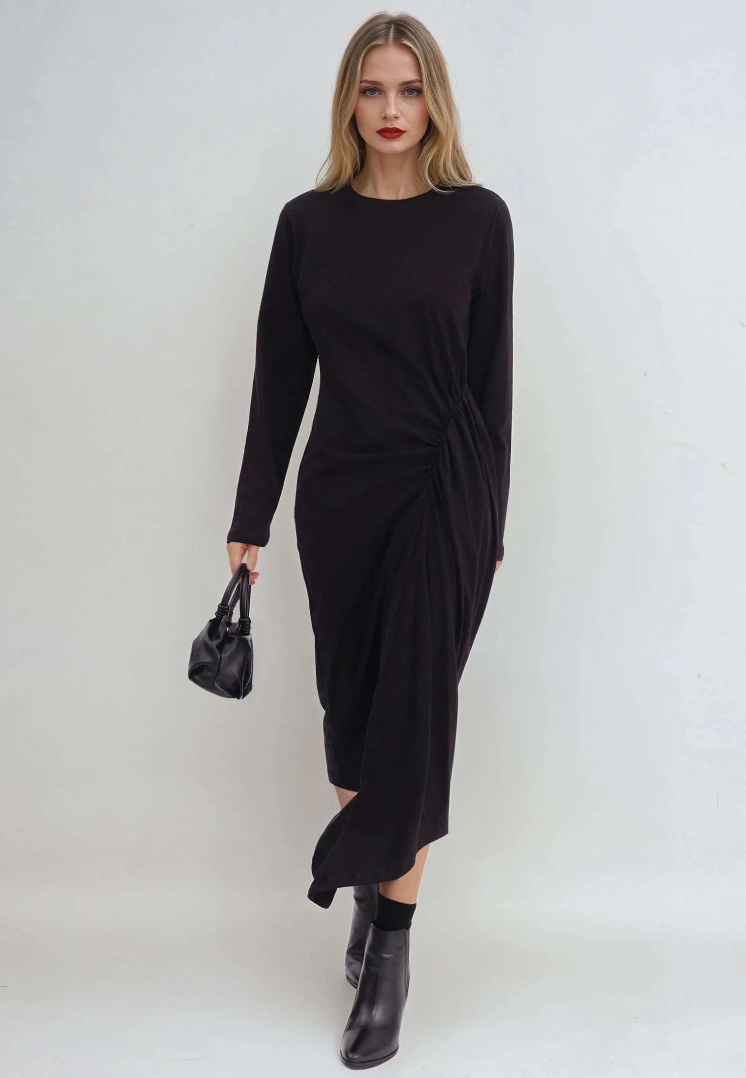 The Flint Dress is a chic, fitted midi dress crafted from soft cotton jersey, featuring a flattering draped design and classic round neckline. With long sleeves and a sleek silhouette, this versatile little black dress effortlessly transitions from daytime elegance to evening sophistication. The model wears a size UK 10. Length from the top: 122 cm