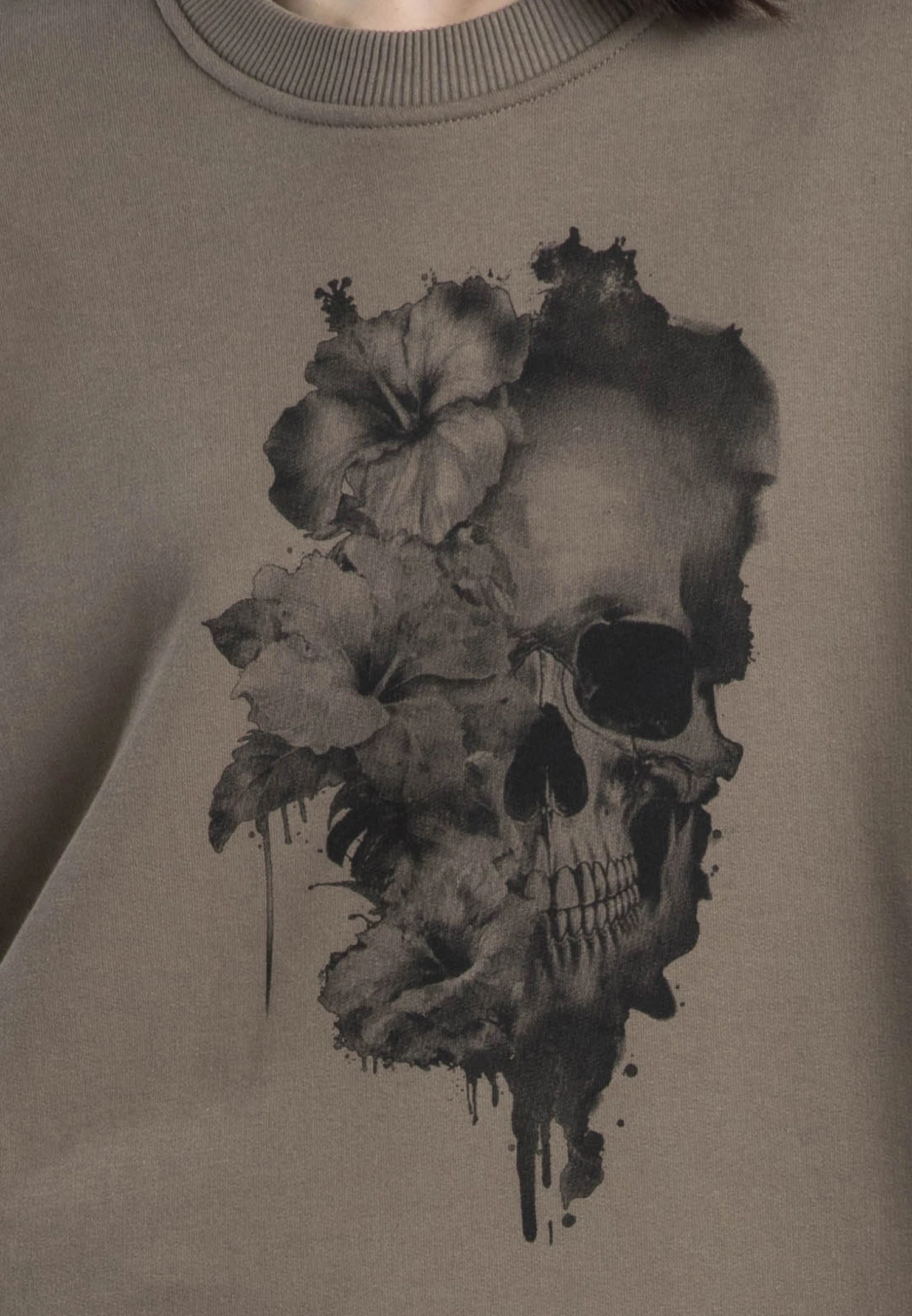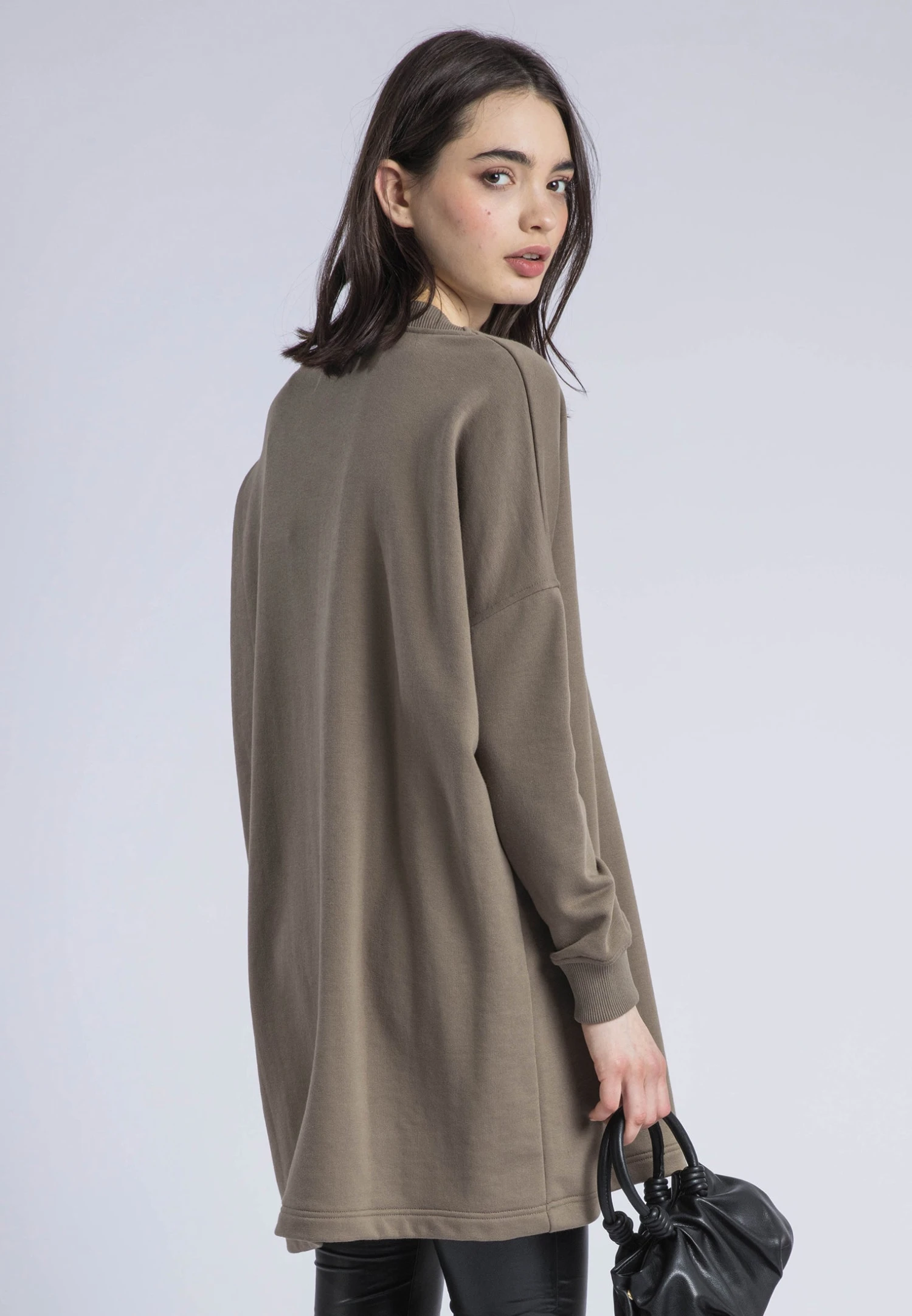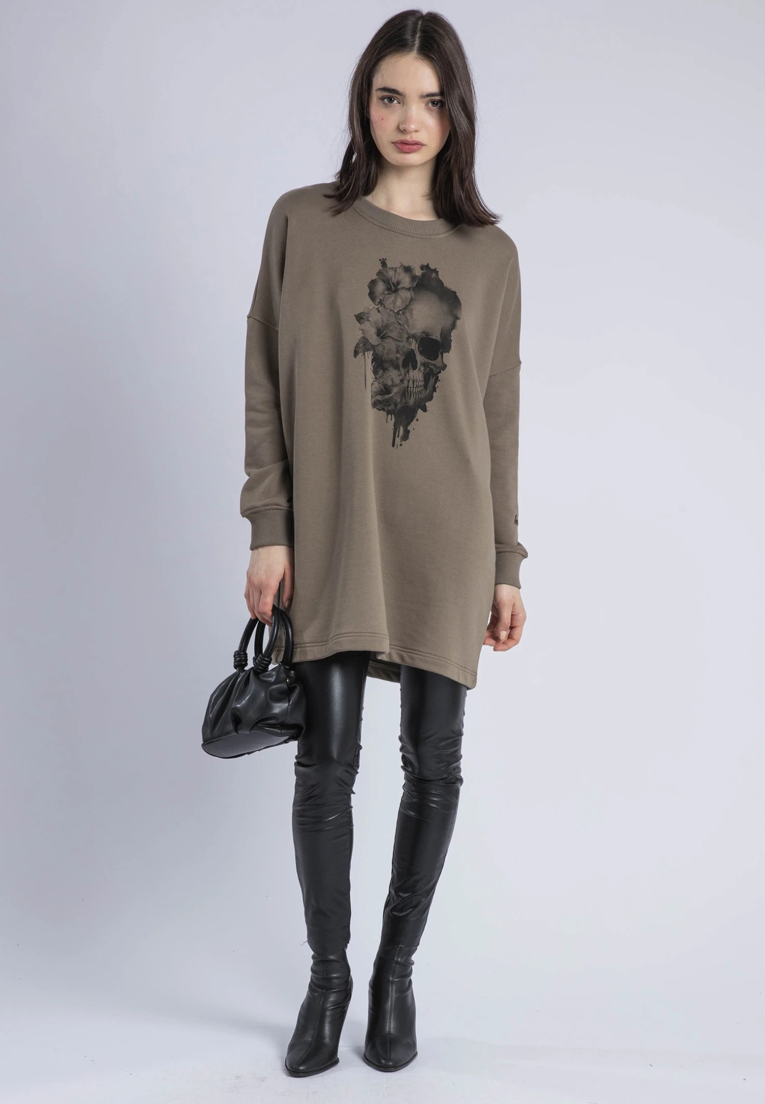The Flora Sweat Dress in brown combines comfort and style in a short, oversized design with long sleeves and a classic round neckline. Featuring our skull print on the chest along with Religion’s signature embroidery at them side, this piece adds an edgy twist to casual wear. Its relaxed fit and unique details make it a perfect choice for laid-back yet stylish looks. Wear with ankle boots or high heels. The model wears a size UK 10. Length from the top: 87 cm.