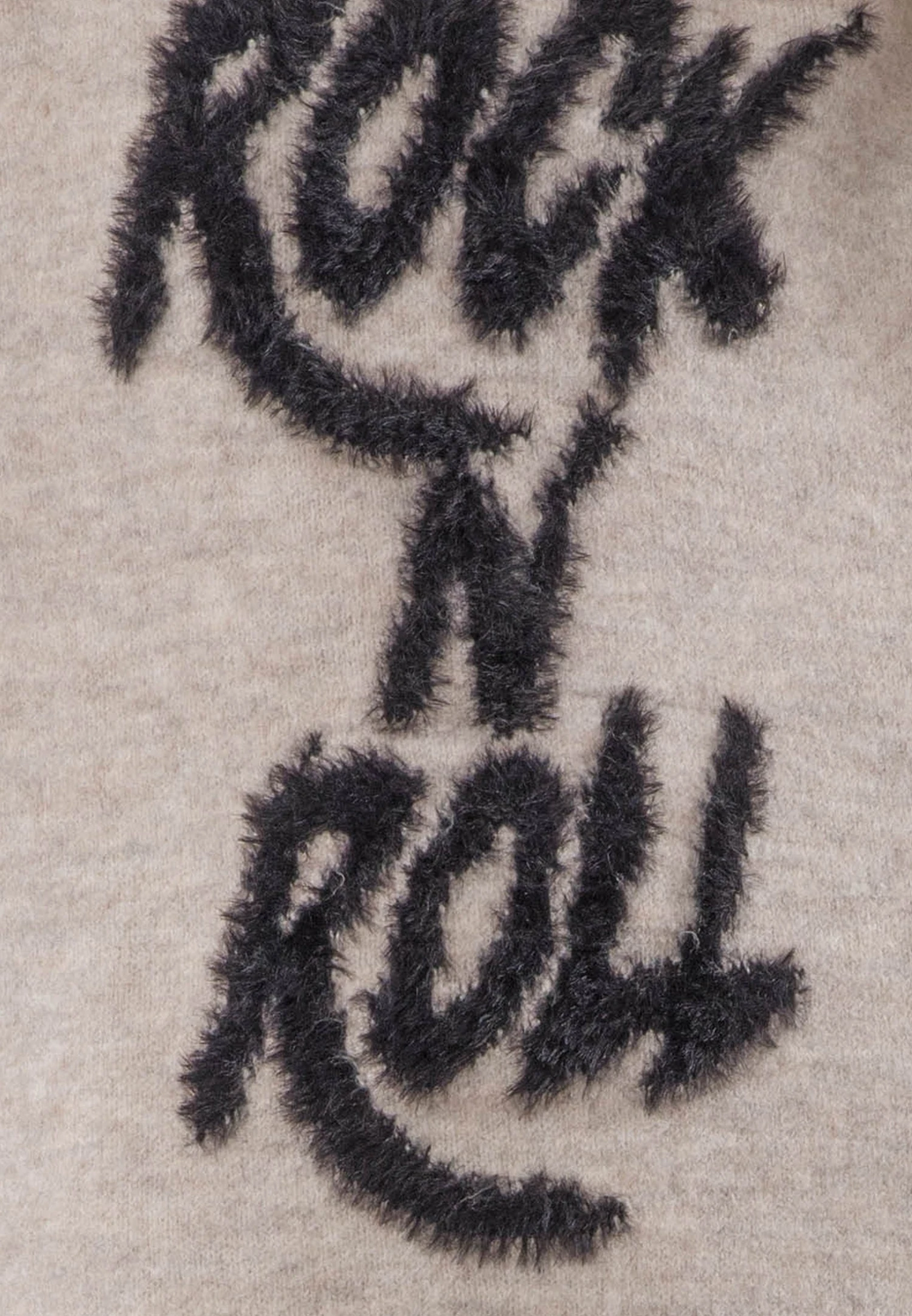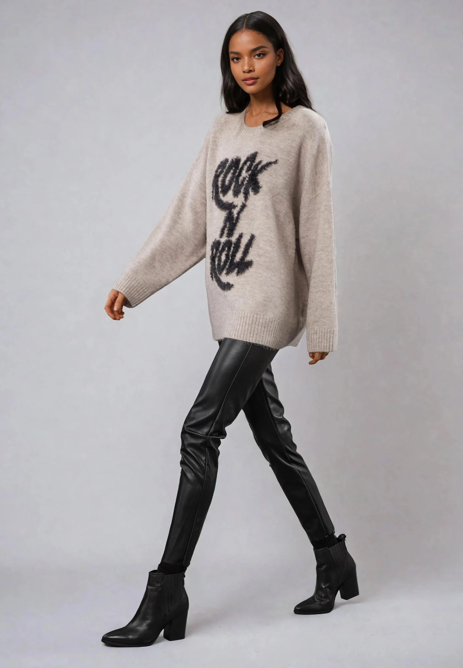 The Hatty Jumper is a must-have for your winter wardrobe. This hip-length wool mix jumper is not just soft and warm but also makes a bold statement with its eye-catching Rock n roll slogan design in dusty pink and black. With long sleeves and an oversized fit, it offers both comfort and style. The classic crew neck adds a touch of versatility, making it the perfect choice to pair with your favourite jeans or leggings for a casual yet fashionable look. The Hatty Jumper is the ideal addition to your collection for standing out and staying cozy this season. The model wears a size UK 10. Please go down 1 size if you like it better less oversized. Length from the top: 70 cm