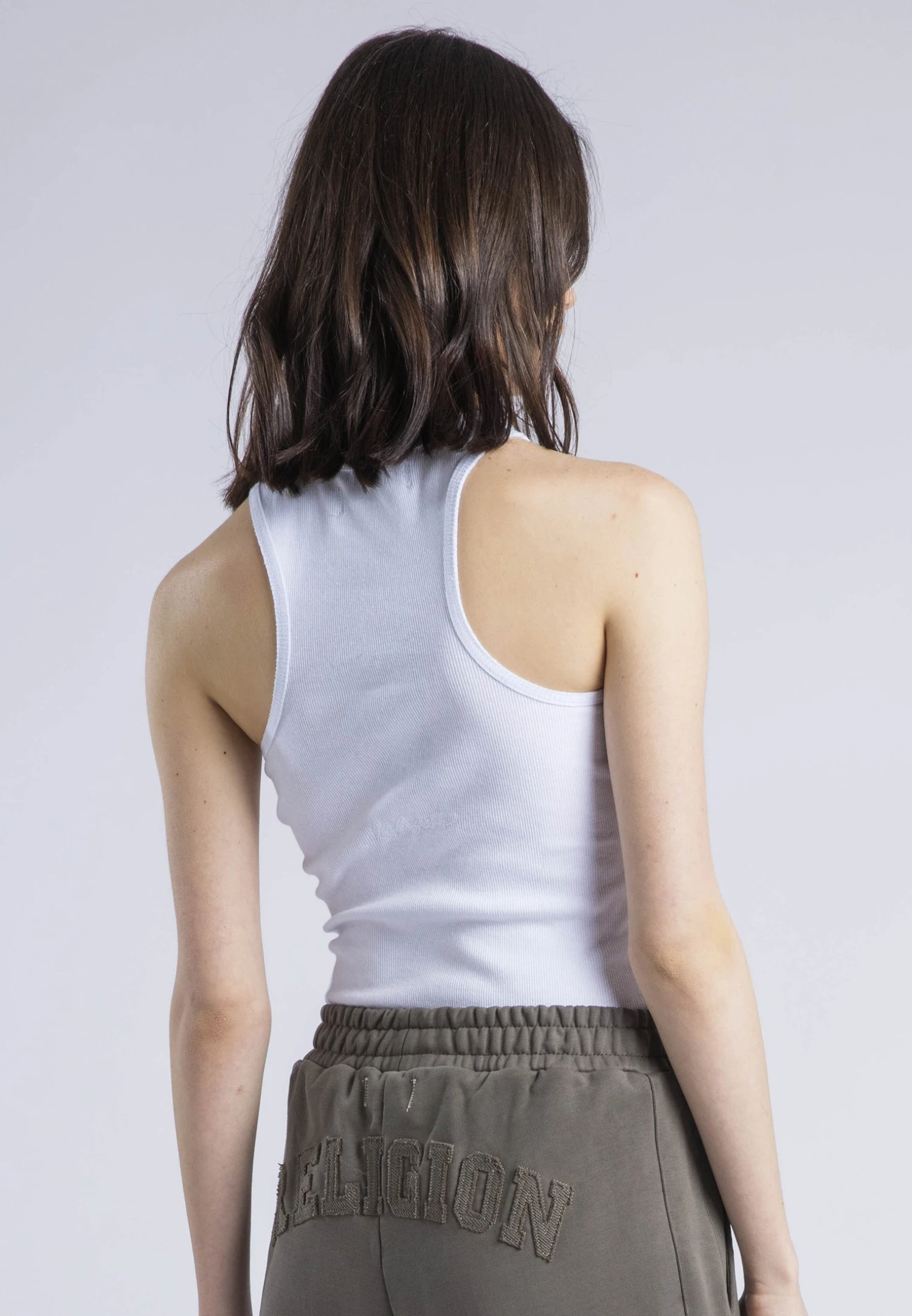 The high-neck vest is a sleek and versatile style crafted from fitted ribbed jersey. Designed with a flattering high neckline and hip-length cut, it’s perfect for layering or wearing solo. The classic white color and RELIGION signature embroidery at the back neck add a timeless and stylish touch to this wardrobe essential. The model wears a UK size 10. Length from the top: 57 cm.