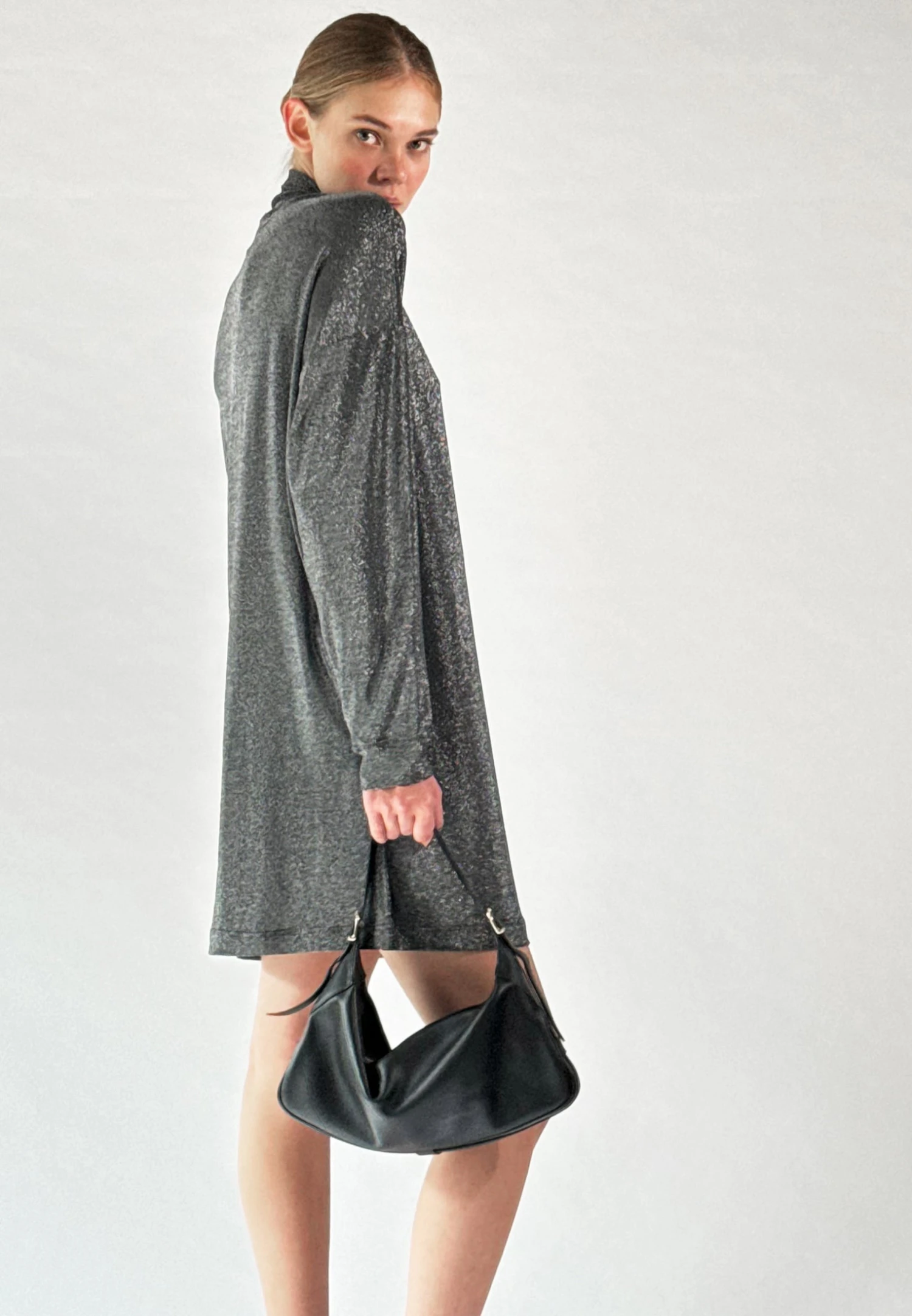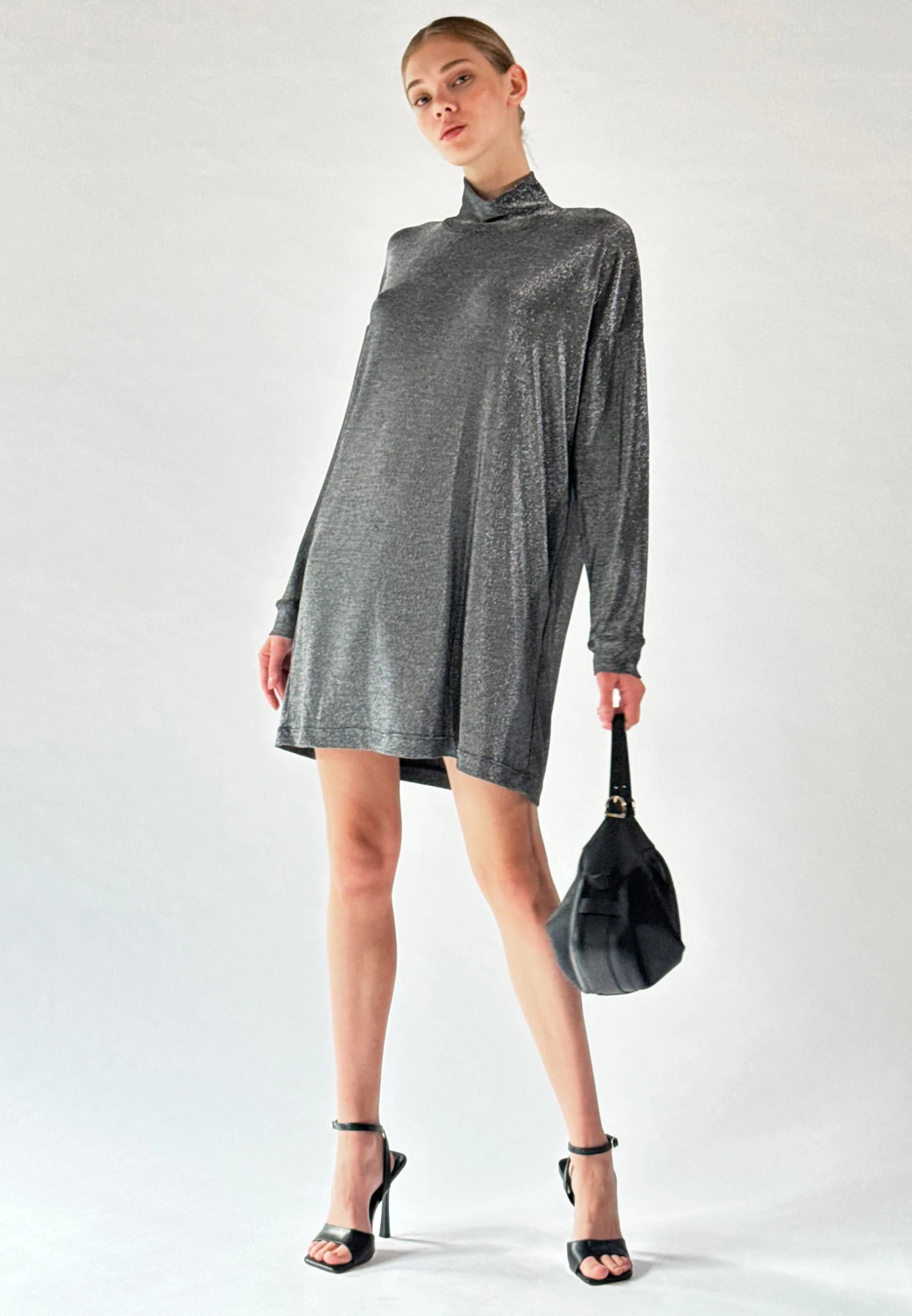 Elevate your style with the Karla Tunic, a dazzling gunmetal lurex jersey piece that effortlessly blends casual comfort with undeniable style. This versatile tunic, featuring a high neck, oversized relaxed fit, short length, and long sleeves, can be dressed up for a night out with leather leggings and heels, or kept casual with your favourite pair of jeans. It’s your canvas to express your unique style, making it the ultimate addition to your wardrobe. The model wears a size S. Length: 84 cm, chest circumference: 116 cm
