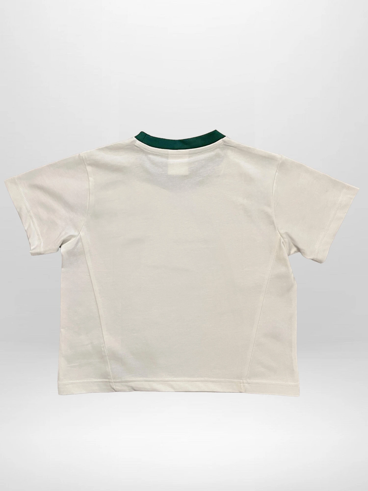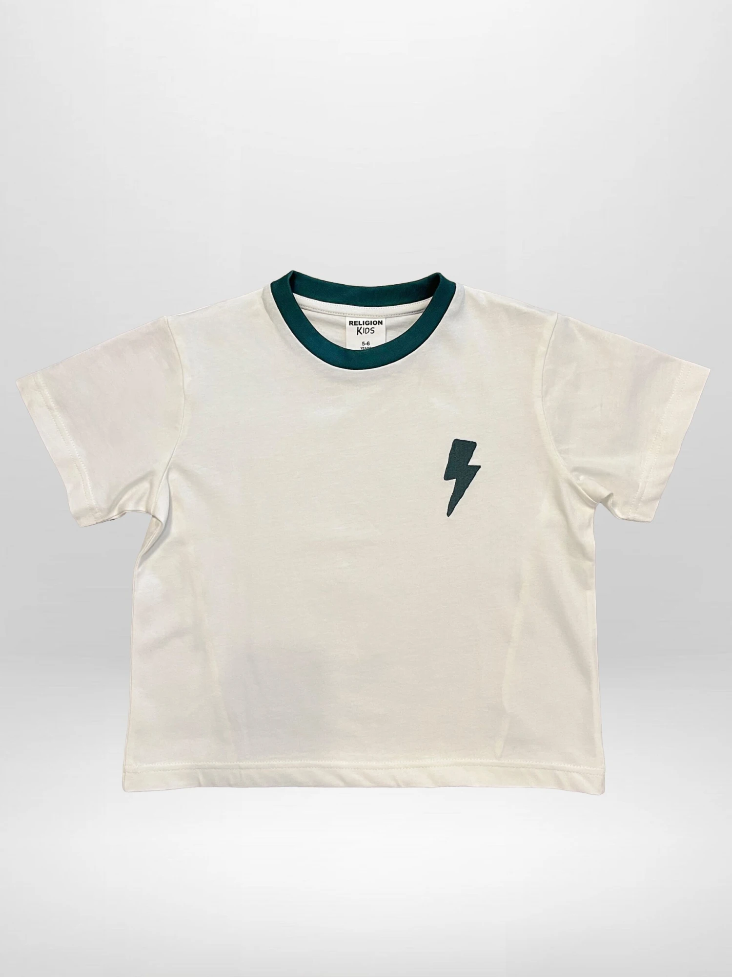 Power up their wardrobe with our Lightning Bolt T-shirt in off white. Featuring a contrasting bottle green crew neckline and a lightning bolt on the chest, adding a spark of energy to their everyday style. Made from soft, breathable cotton with a relaxed fit, it’s perfect for playtime, adventures or just hanging out in style. Ideal for both boys and girls.