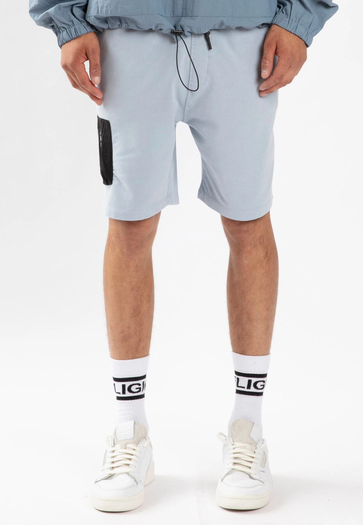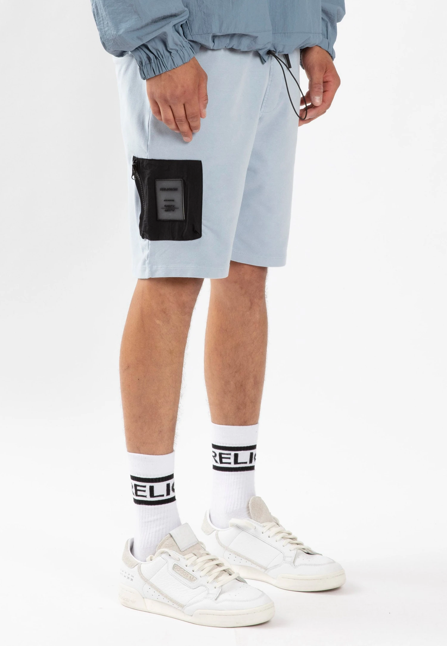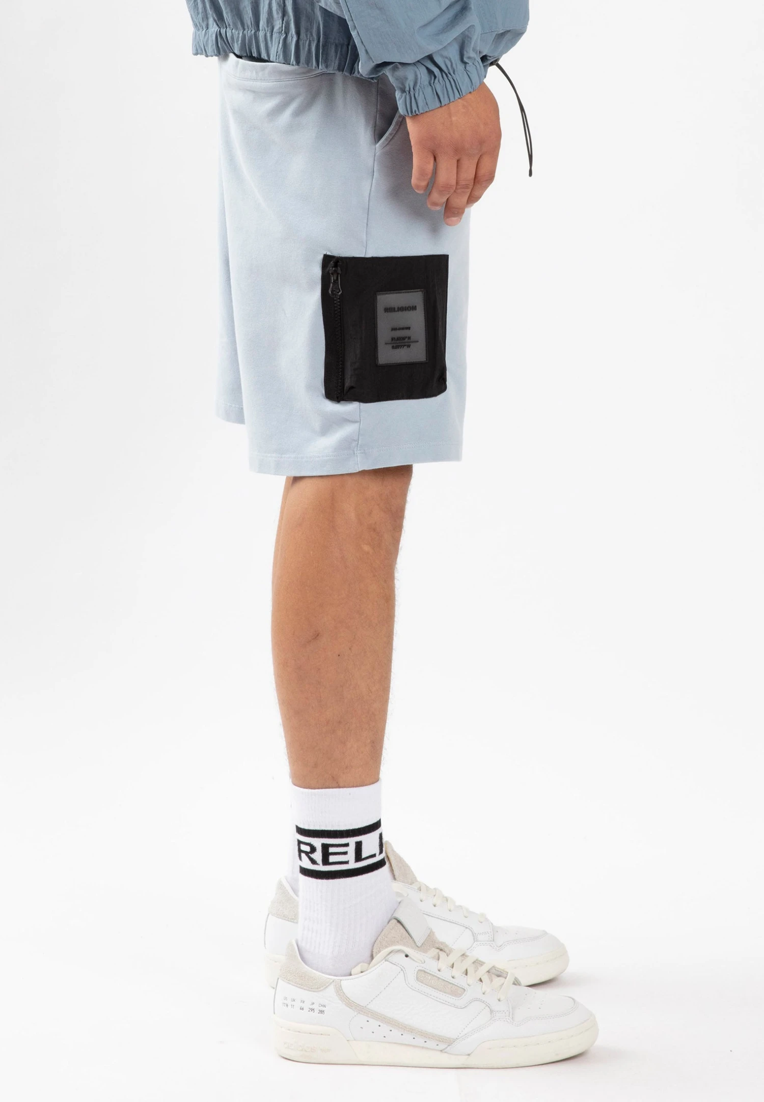 The Recruit Shorts. Made from our new loop back sweat in a ‘washed illusion blue’, with elasticated drawstring waist. With nylon zipper pocket with frosted patch on the leg. Easy and relaxed for everyday styling.