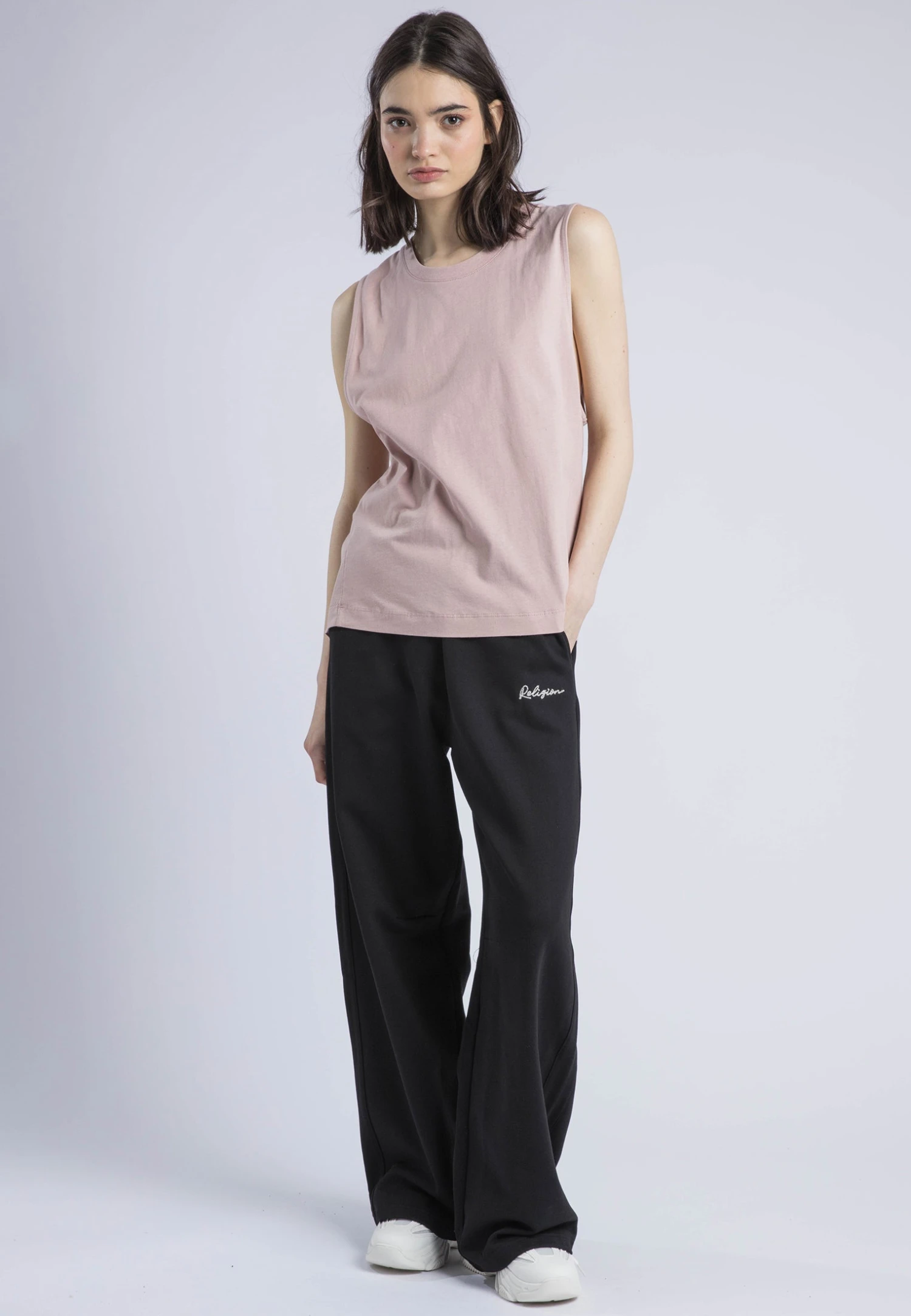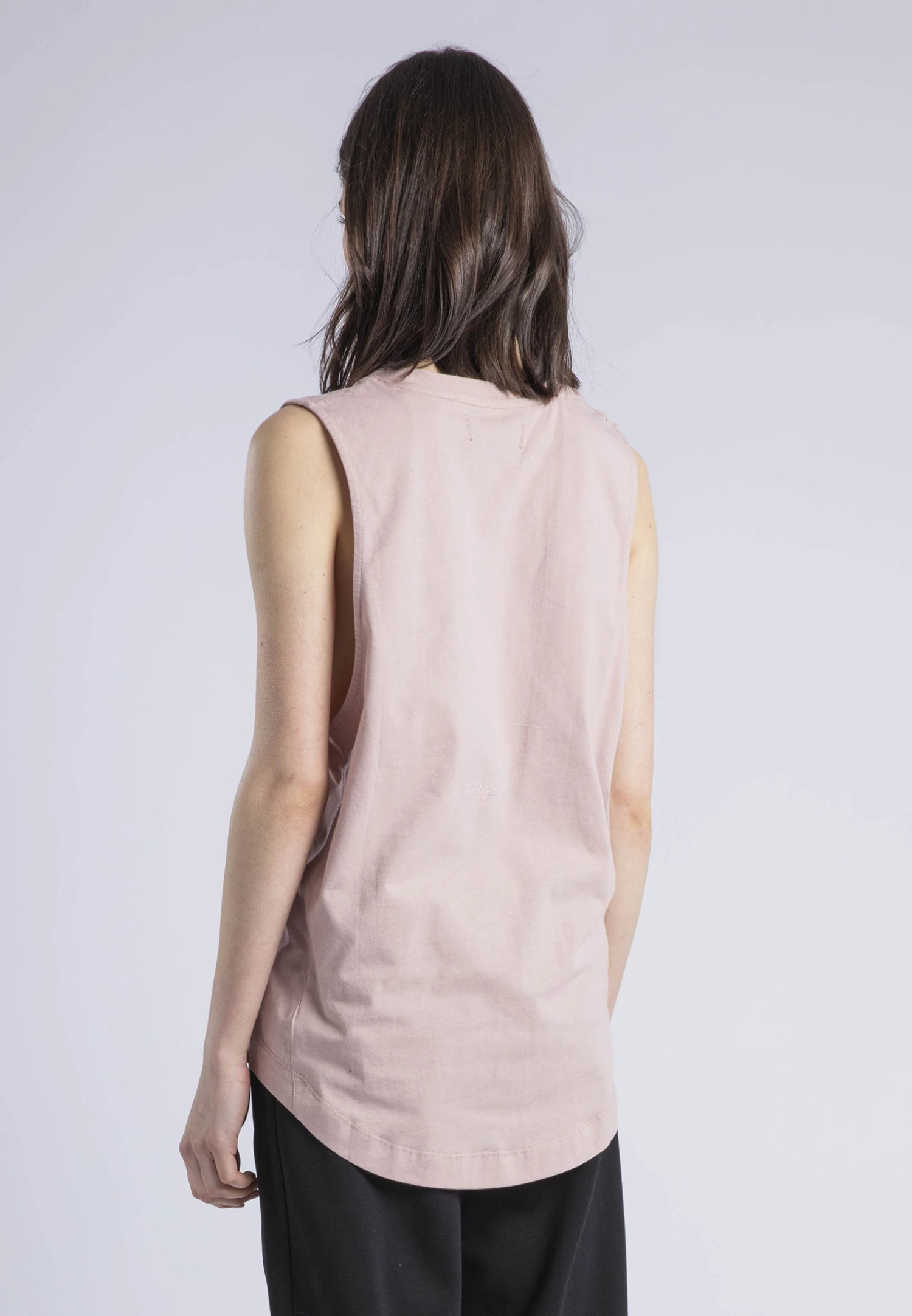 The relaxed vest top in a dusty pink is a versatile style crafted from soft, sustainable cotton jersey. Featuring a crew neck, hip-length design, low armholes, and a rounded back hem for effortless style. Finished with RELIGION signature embroidery at the back neck for a distinctive touch. Perfect for casual layering or lounging. The model wears a size UK 10. Length from the top: 66 cm.