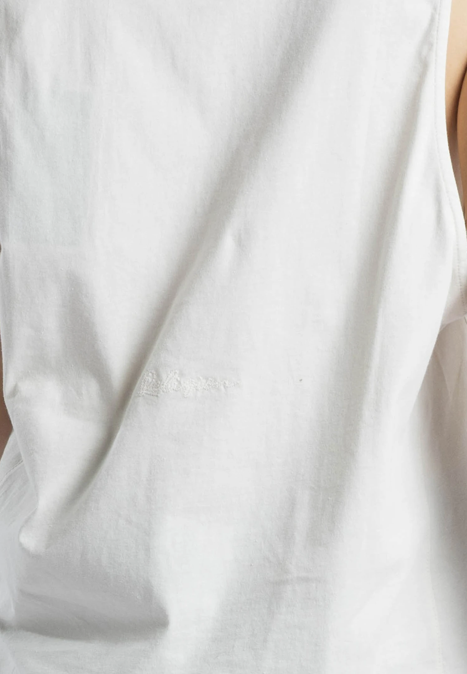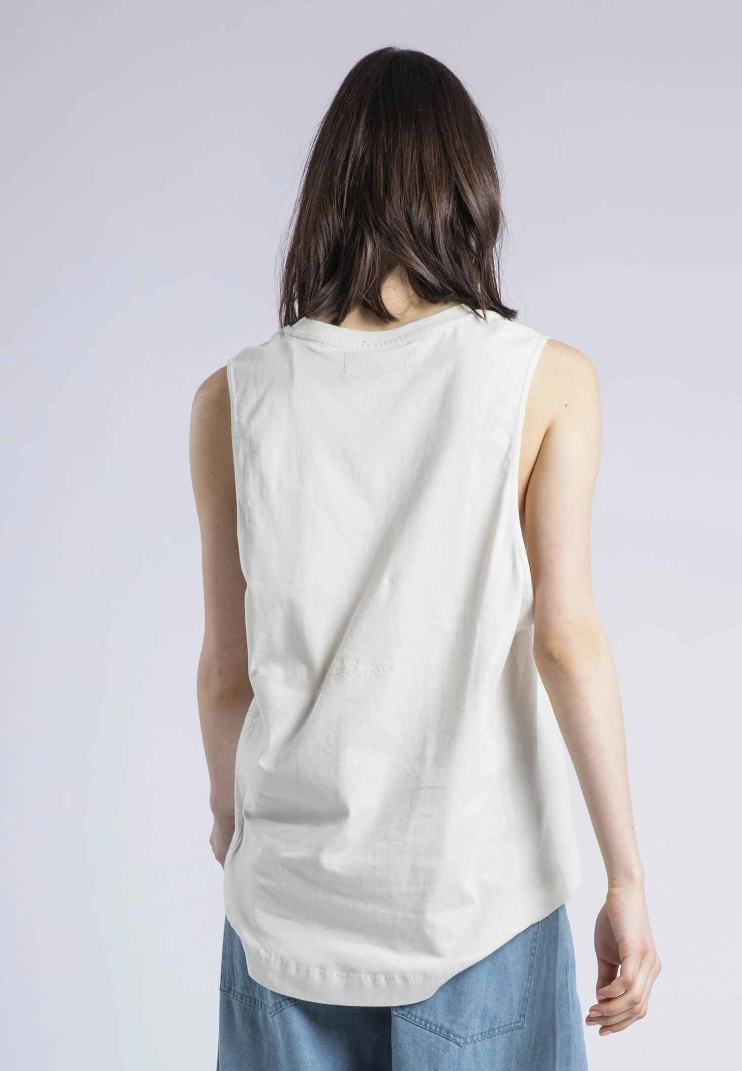 The relaxed vest top in an off white is a versatile style crafted from soft, sustainable cotton jersey. Featuring a crew neck, hip-length design, low armholes, and a rounded back hem for effortless style. Finished with RELIGION signature embroidery at the back neck for a distinctive touch. Perfect for casual layering or lounging. The model wears a size UK 10. Length from the top: 66 cm.