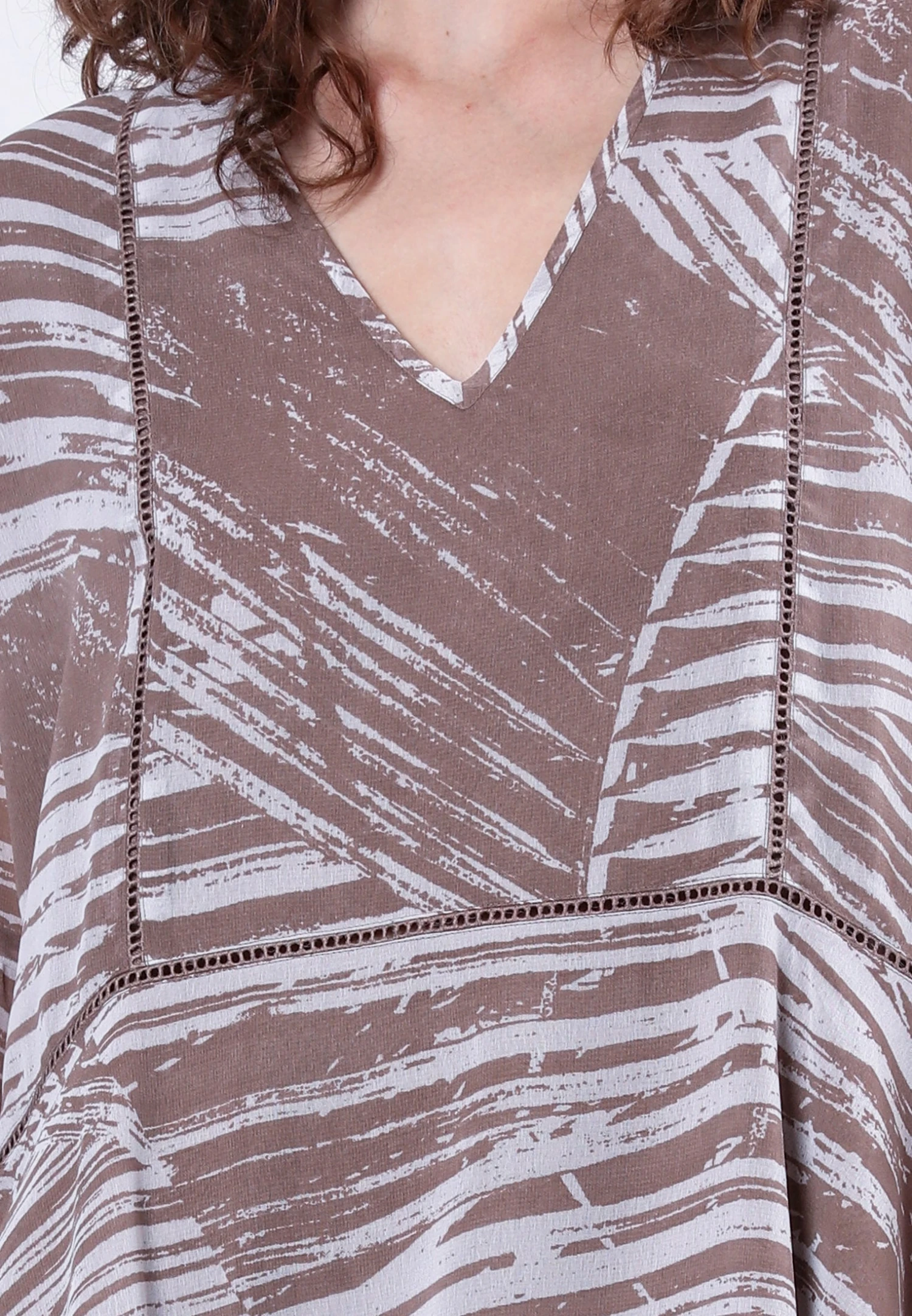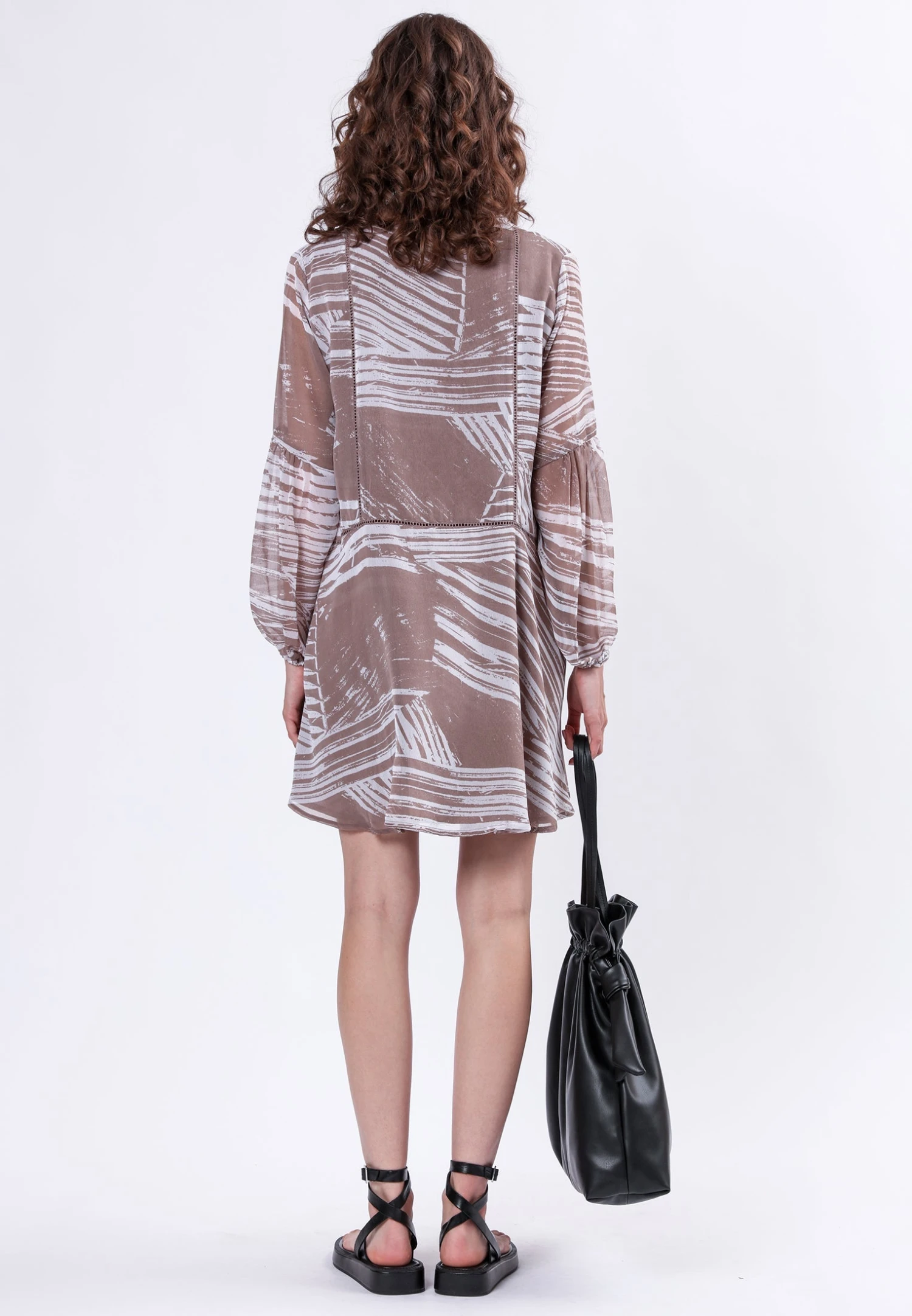 The Ruby short dress is an easy-fit dress showcasing our hand-painted Shipwreck print in neutral tones. It features a flattering V-neckline, long bell sleeves, and intricate ladder trim detailing. This versatile piece pairs beautifully with ankle boots for a chic look or sandals for a more casual vibe. Perfect for any occasion, it effortlessly combines style and comfort. The dress has an oversized fit, please go down 1 size if you like it better less oversized. The model wears a size S. Length from the top: 88 cm