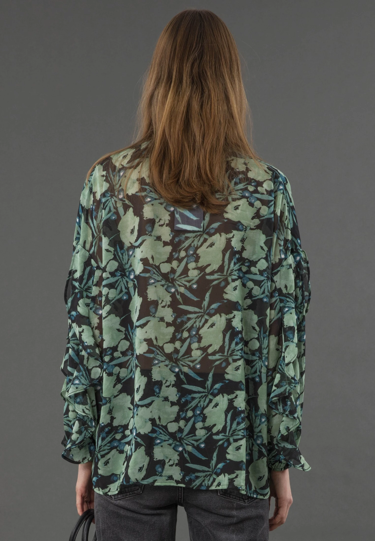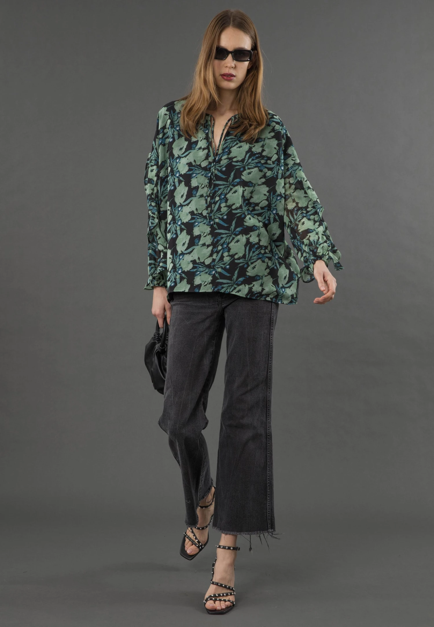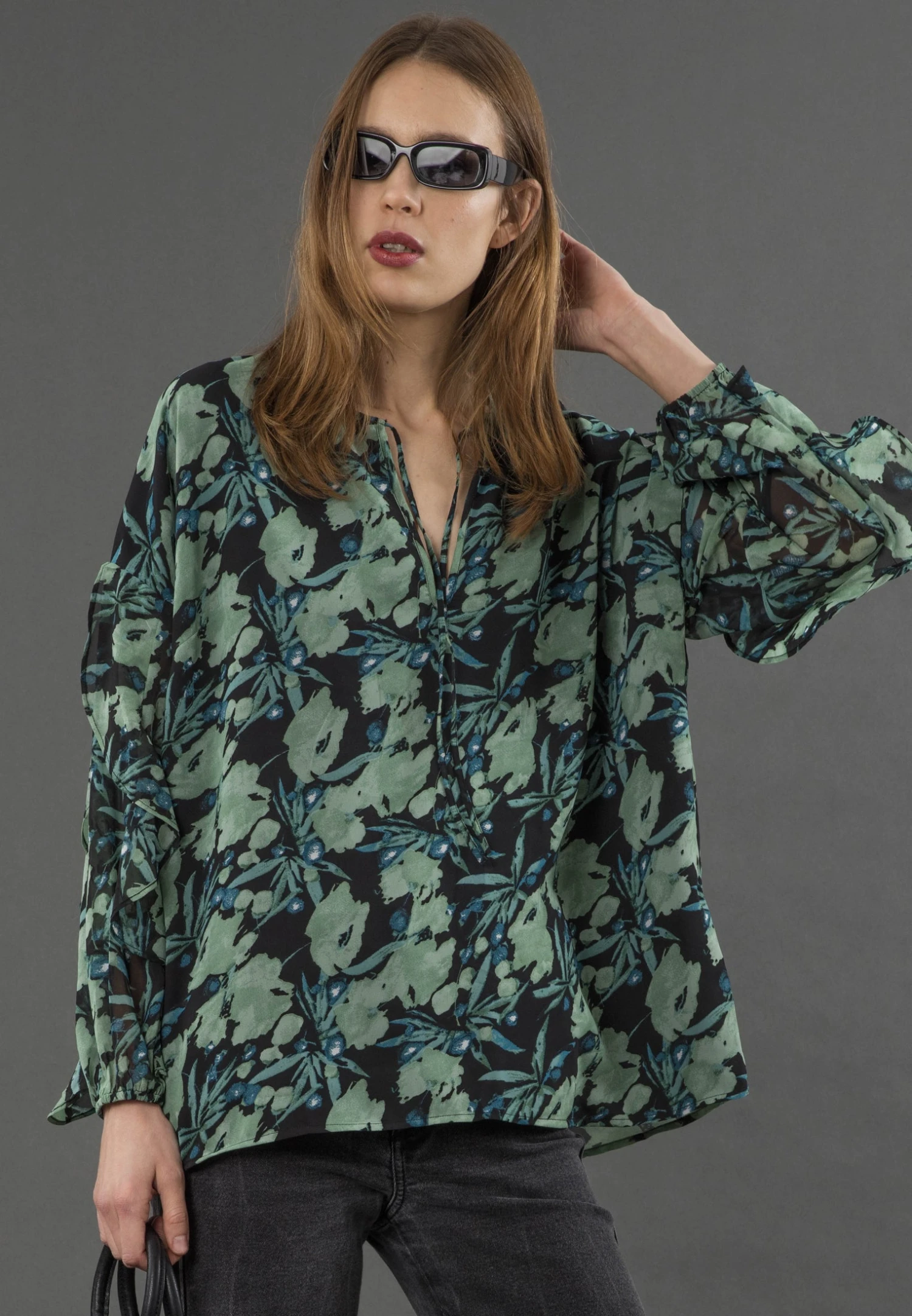 The Solstice Top is a luxurious round neck top crafted in our floral Prime print in green. This hip-length top features charming tie detailing at the neckline and sleeves with a playful frill and elasticated cuffs, creating volume. Designed with an oversized fit, the Solstice Top combines comfort and sophistication, making it a versatile addition to your wardrobe for any occasion where you want to shine effortlessly. Wear with jeans or tailored trousers. This top has an oversized fit, please go down 1 size if you like it better less oversized. The model wears a size UK 10. Length from the top: 65 cm