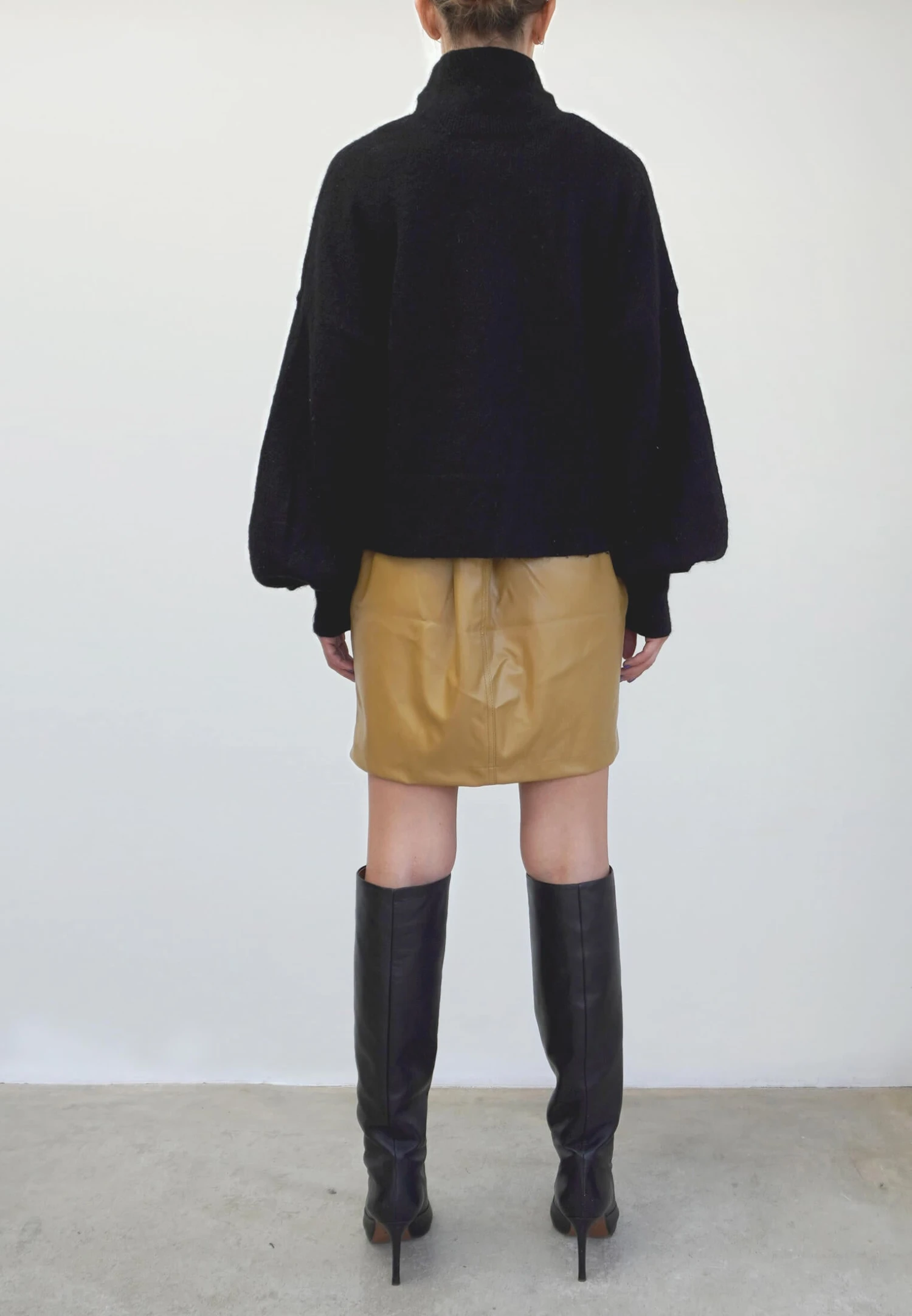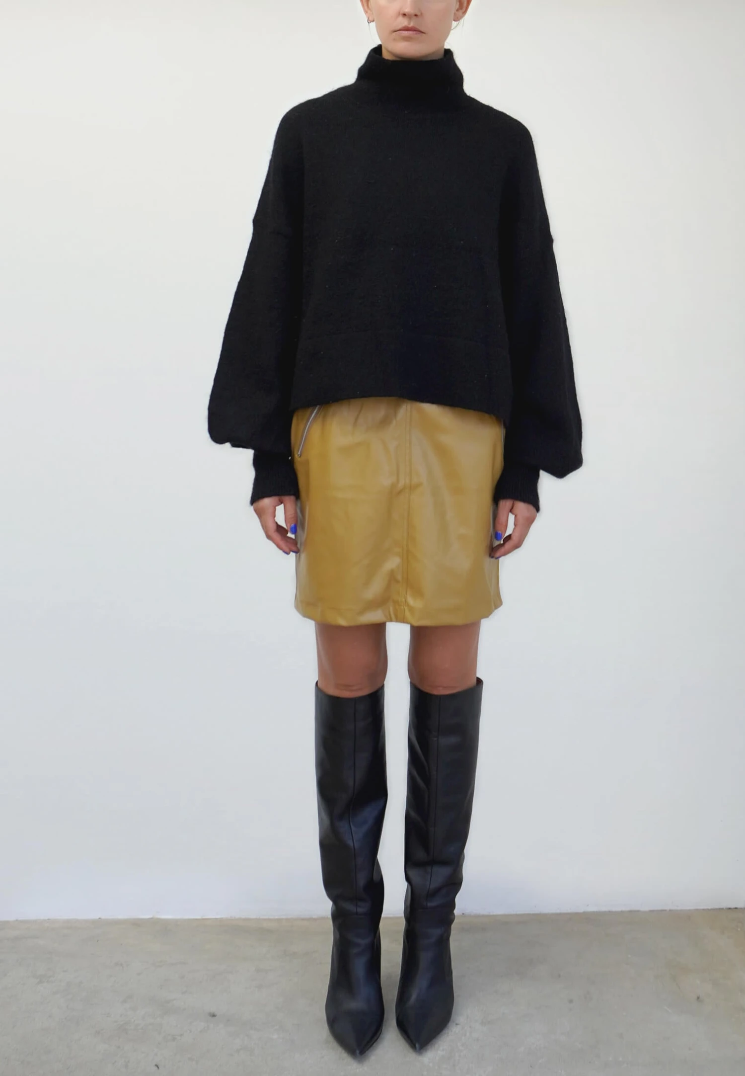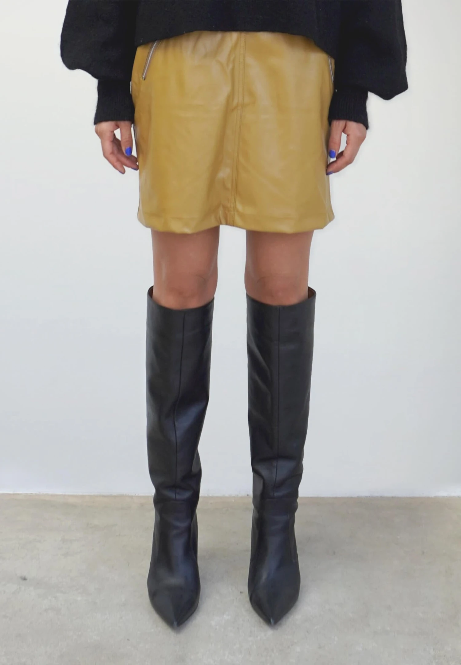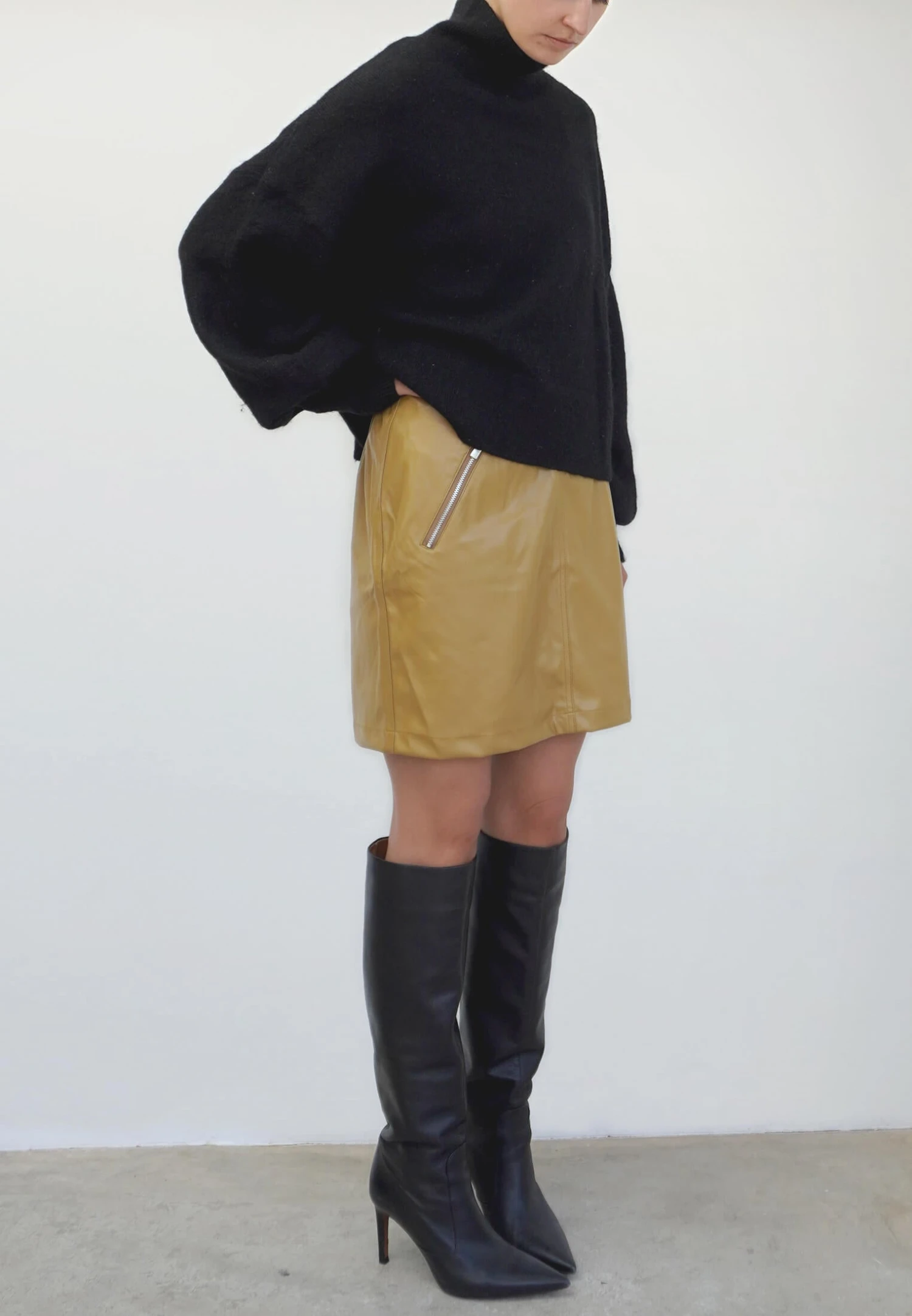 The Sun skirt is a contemporary way for day-to-night dressing, fabricated in camel vegan leather. This style has a relaxed fitted shape, zip pockets and an elasticated back waist for ease and comfort. This short skirt will give you an instant outfit update and will be relevant all year round.