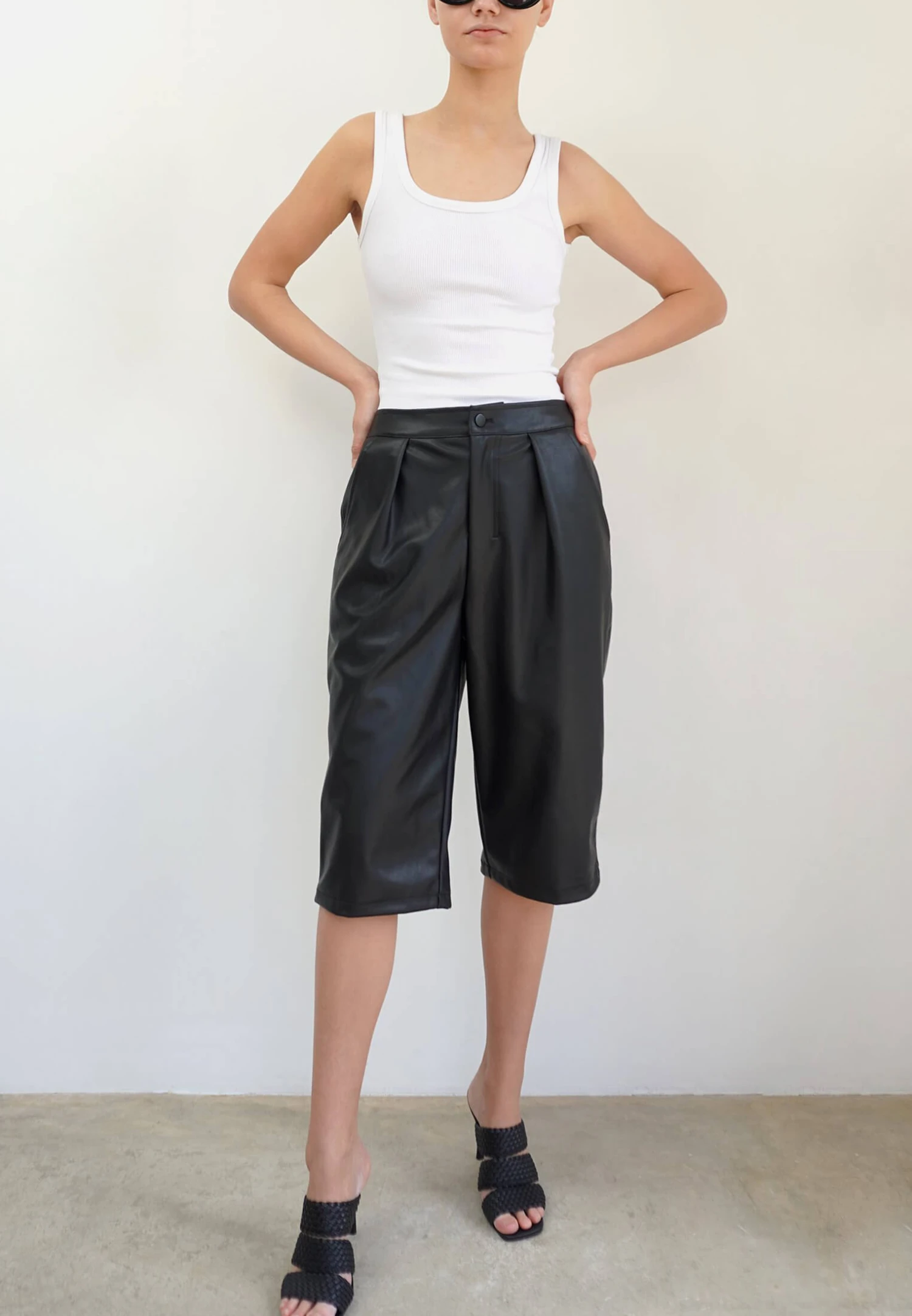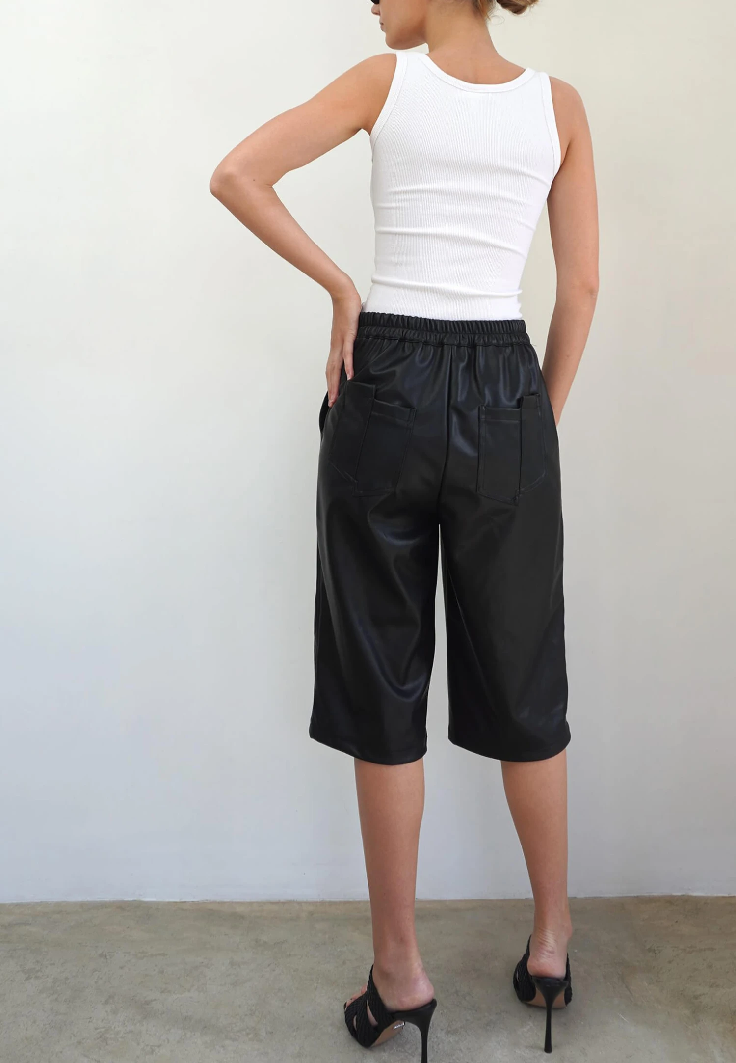 The system shorts are effortlessly cool in black faux leather. These boyfriend fit shorts are over the knee, feature our split pockets at the back, pleats at the front and have an elasticated back waist for ease and comfort. Dress up with heels and a shirt or down with trainers and a jumper. The model is wearing a size S.