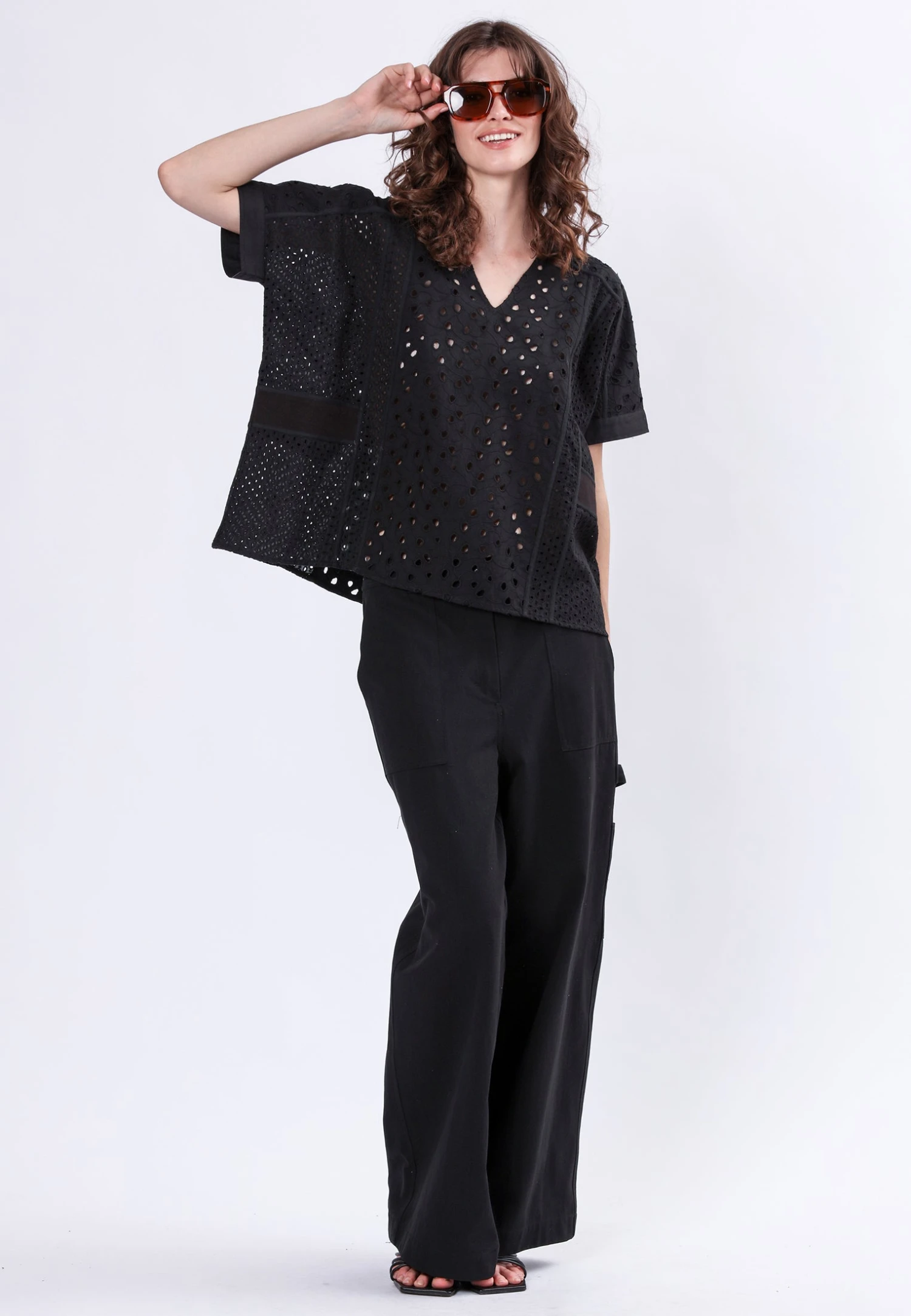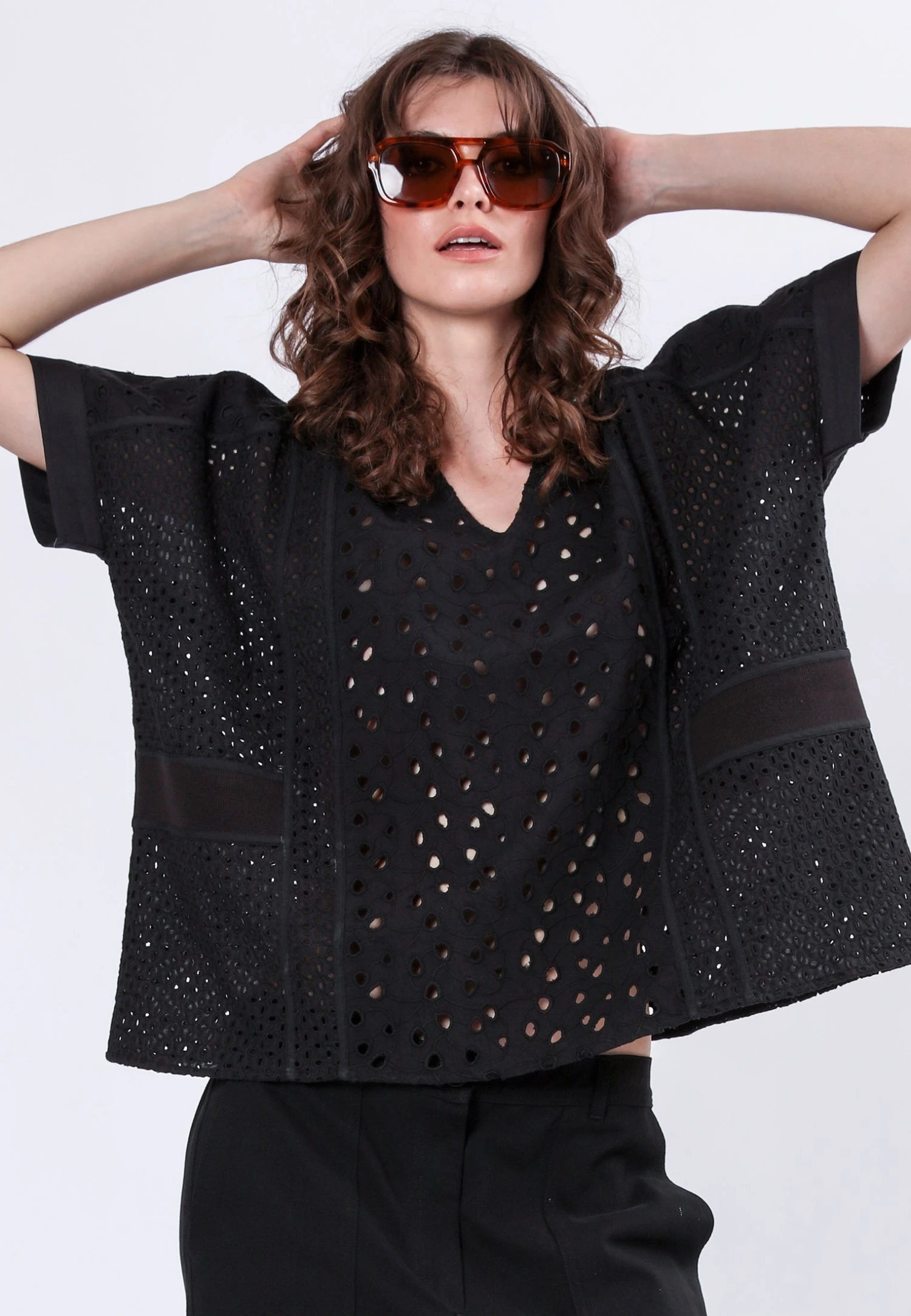 Introducing the Topaz top, a delightful blend of charm and versatility. Crafted from a luxurious cotton broderie anglaise mix, this top exudes timeless style with a modern twist. Featuring a flattering V-neckline and a collar stand, it adds a touch of sophistication to any ensemble. The short sleeves and hip-length silhouette offer comfort and ease, while the oversized fit provides a relaxed and effortless vibe. For a more tailored look, simply size down. Whether paired with jeans for a casual day out or dressed up with trousers for a night on the town, the Topaz top is a wardrobe essential, effortlessly elevating your style with its understated elegance. The model wears a size S. Length from the top: 63 cm