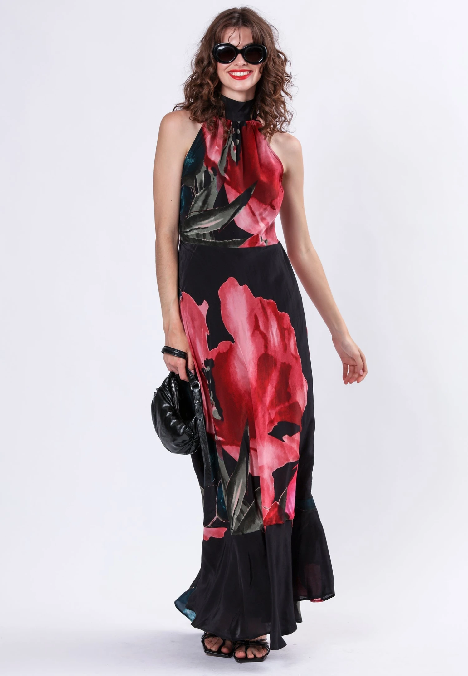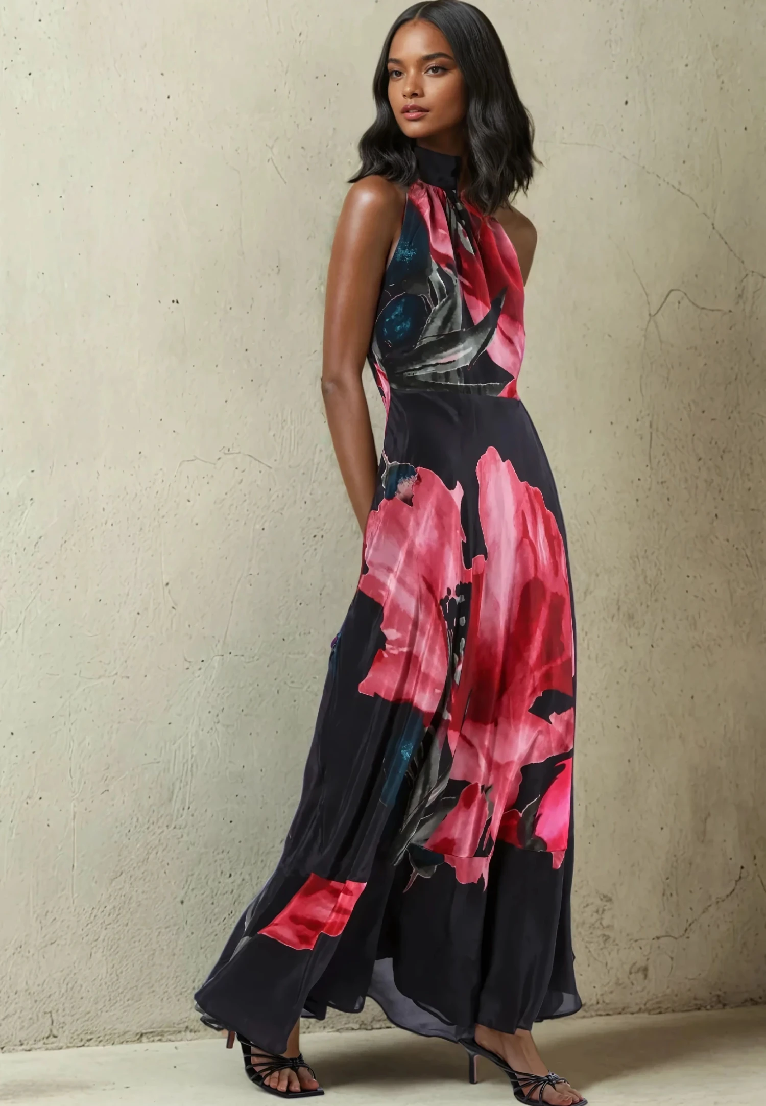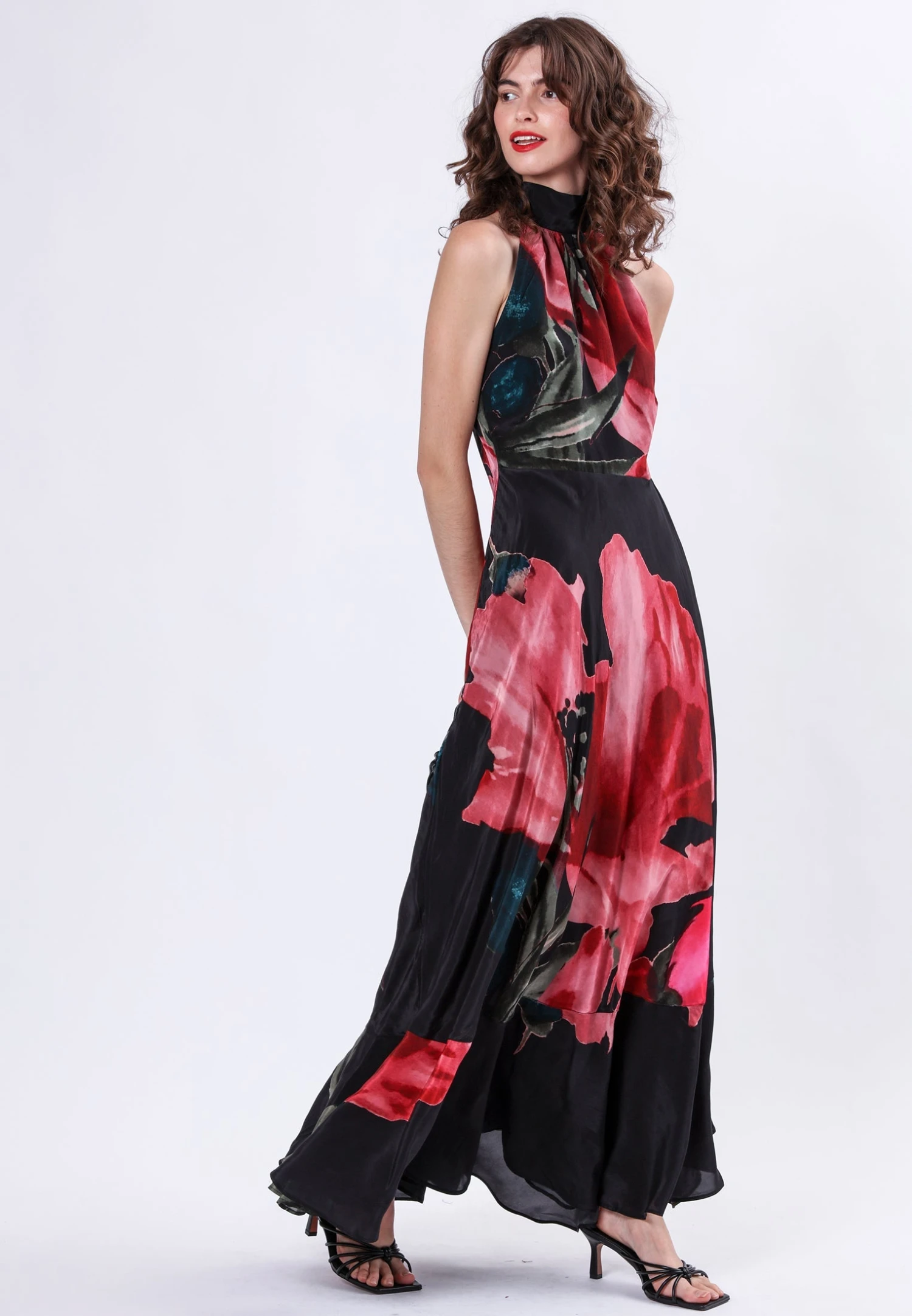 The Valeria maxi dress is a stunning style featuring a halter neck dress with long ties and crafted from vegan silk. Cut on the bias, the silhouette drapes beautifully, accentuating your figure with effortless charm. Sleeveless and adorned with our floral Prime print in pink tones, it exudes romance and sophistication. Whether you’re attending a wedding or exploring exotic destinations, the Valeria maxi dress is sure to captivate hearts with its timeless beauty and allure. The model wears a size S. Length from the top: 146.5 cm. Lightly steam this style before trying it on as shipping might have creased the fabric.